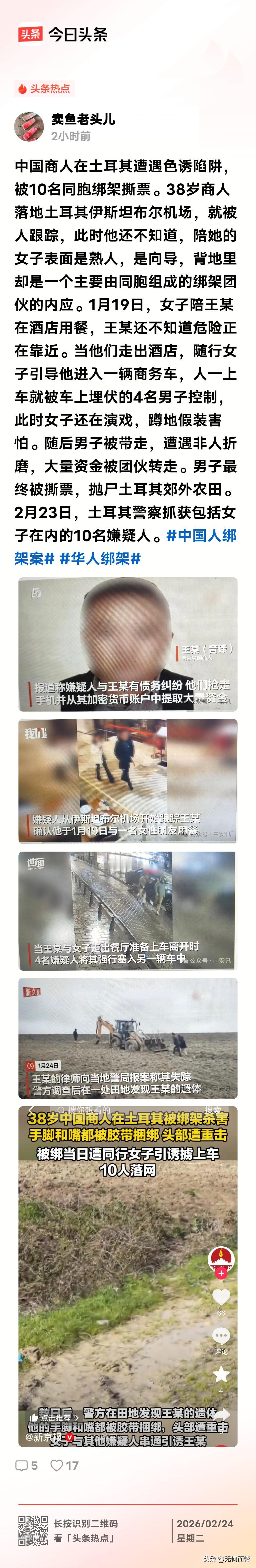 38岁的中国商人在土耳其伊斯坦布尔遇害,害他的不是别人,都是自己的同胞,看到这样的消息真是让人不寒而栗,以前就听别人警示过,在国外最危险的人不是老外,而是自己的老乡,老乡骗老乡,两眼泪汪汪,老乡害老乡,一点都没商量,手段之残忍,令人发指,再一次提醒好朋友们,到国外的时候,一定要当心老乡的面孔和老乡的黑心!