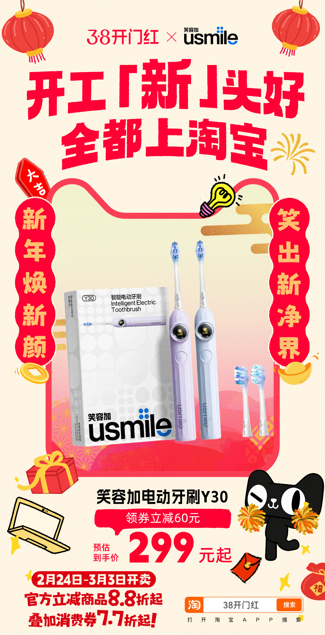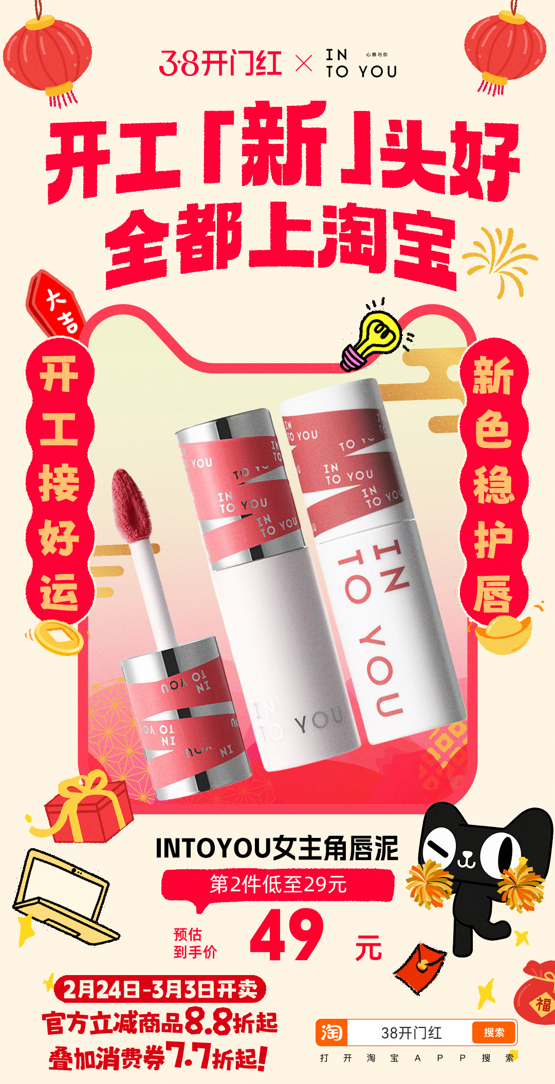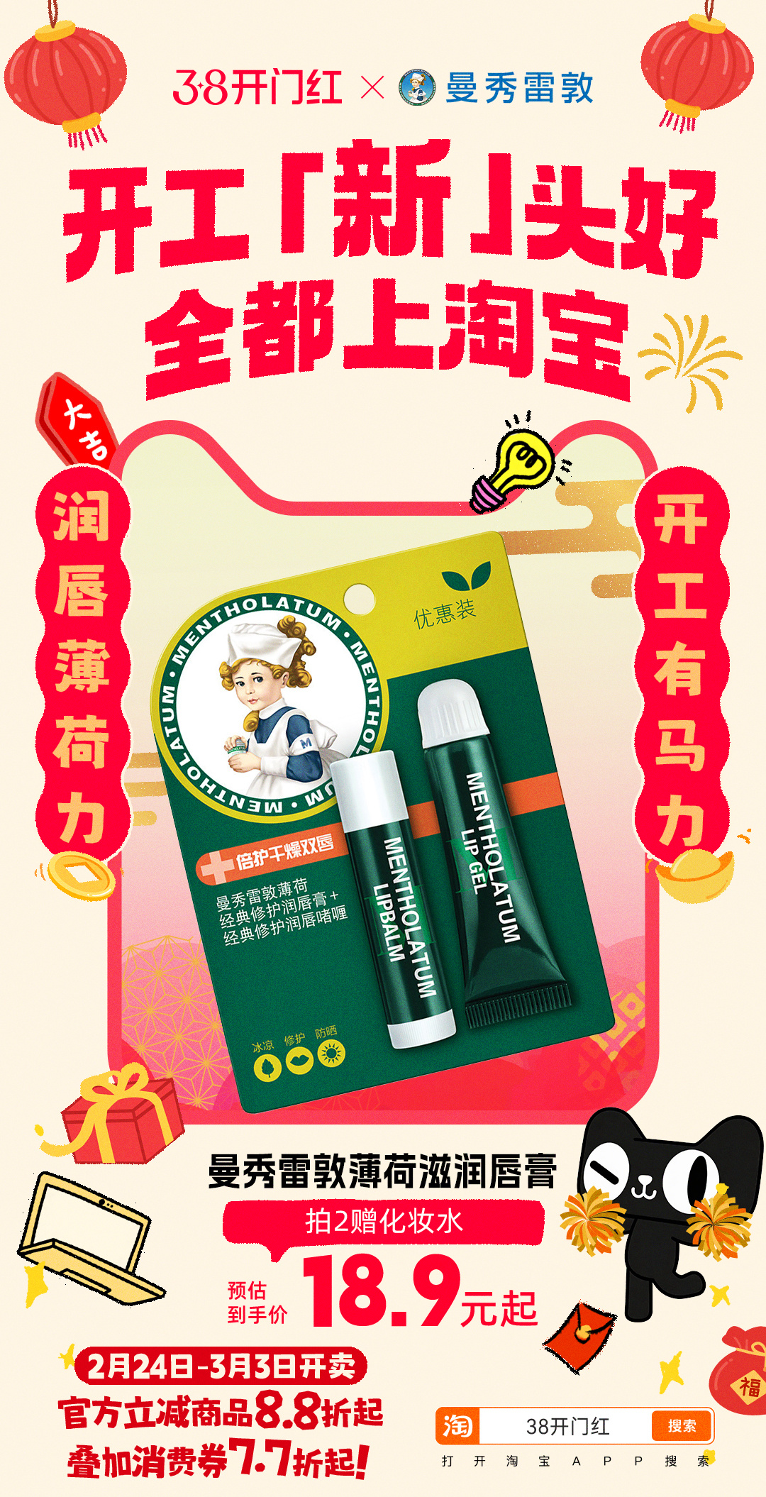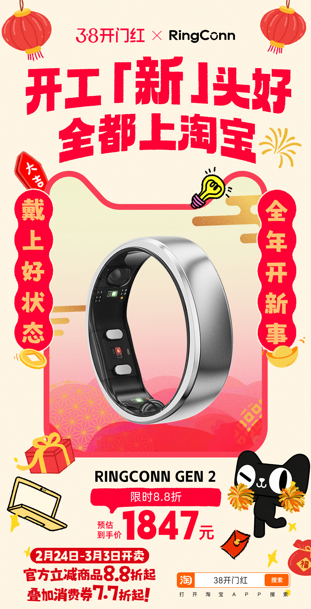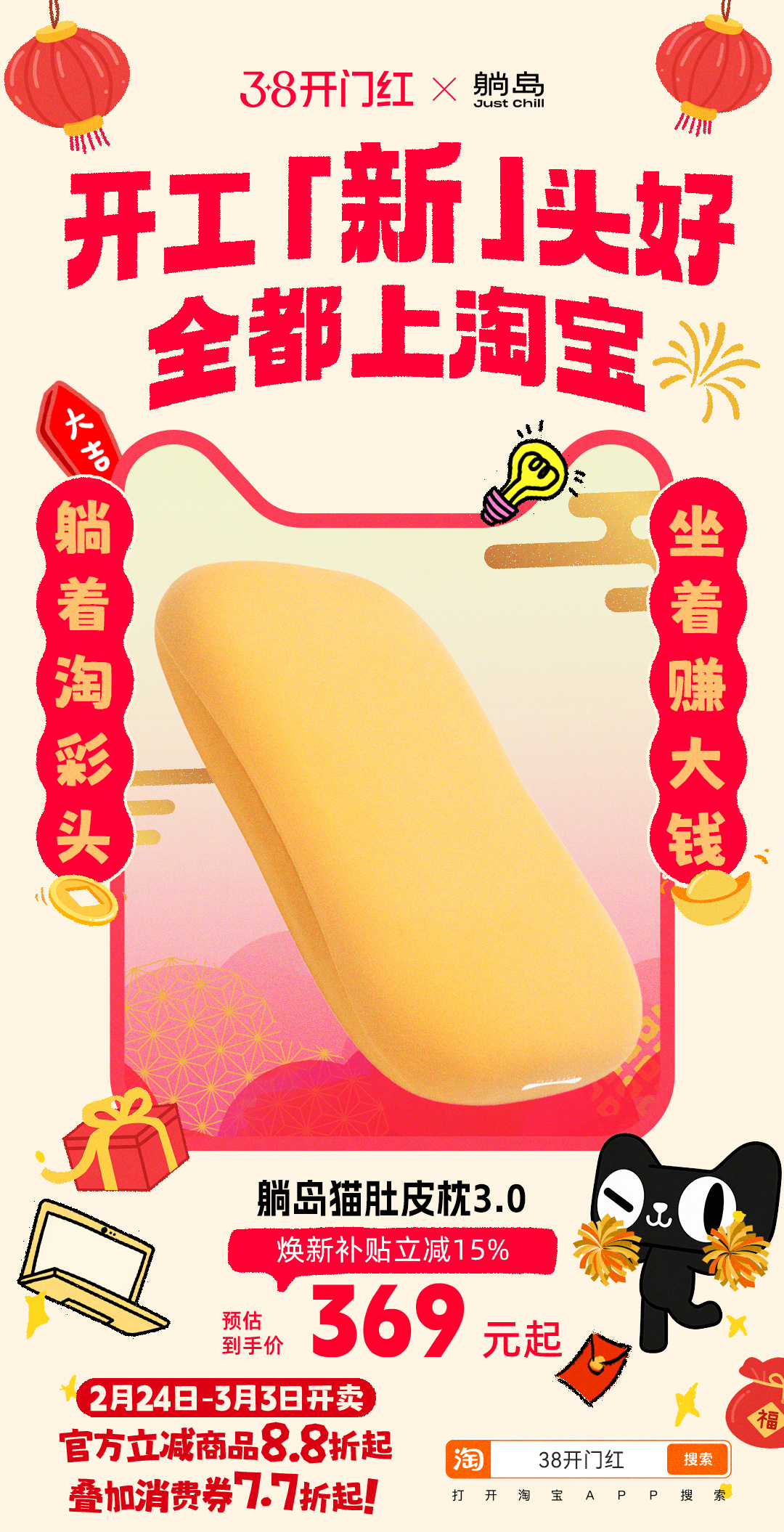 开工新头好全都上淘宝 马年开工,不求大富大贵,只求顺顺当当。把工位布置成喜欢的样子,把节奏调成舒服的模式,2.24-3.3,打开天猫搜索【38开门红】,官方立减8.8折起,叠加消费券7.7折 上淘宝开工淘个好彩头