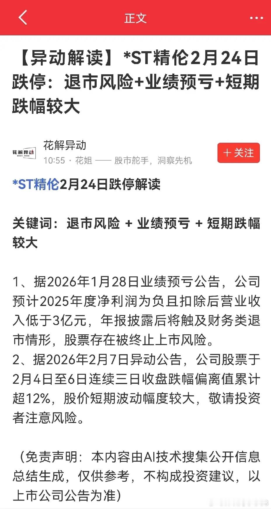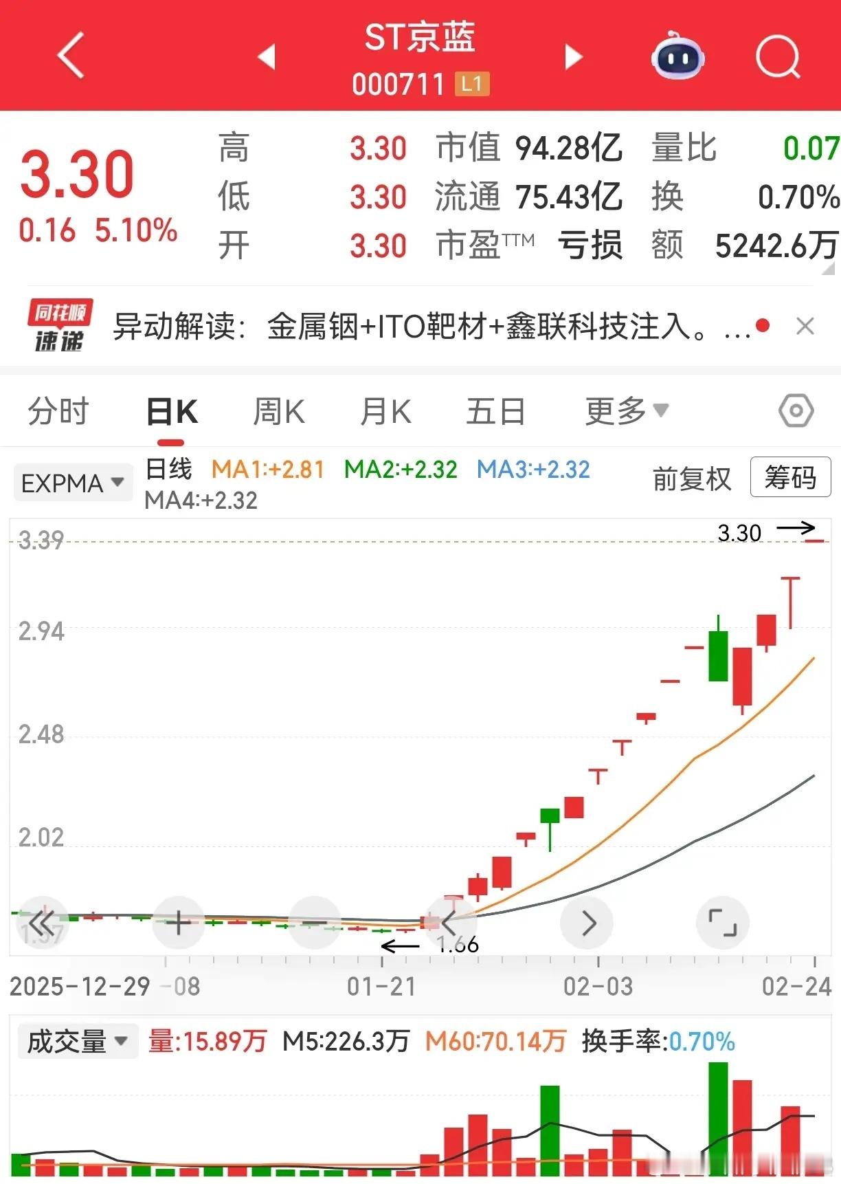 16天13板,你敢相信,这是一个预计亏损公司的股价走势?资金比较疯,如此走势,一般人不容易搞懂这里面隐藏什么玄机。同样是被风险警示的股票,ST京蓝能如此大涨,而*ST精伦则走向另外一个极端,连续大跌,跌了还要跌,中间有过抵抗,每一次抵抗每一次阳线,都是引诱散户进场,再跌几天,股价就不能以元为整数单位了,惨烈!此股因收入低于3亿且净利润亏损,搞不好真会退市,曾经也是各种概念牛哄哄的,去年我还买过,幸亏眼亮及早离场。还有一个*ST波导,当时与精伦电子一起被戴帽子的,25年业绩预告看,收入超过3亿这道坎了,走势要好得多。对于ST个股,我觉得还是看看就好,不知道内幕的,真容易踩雷。