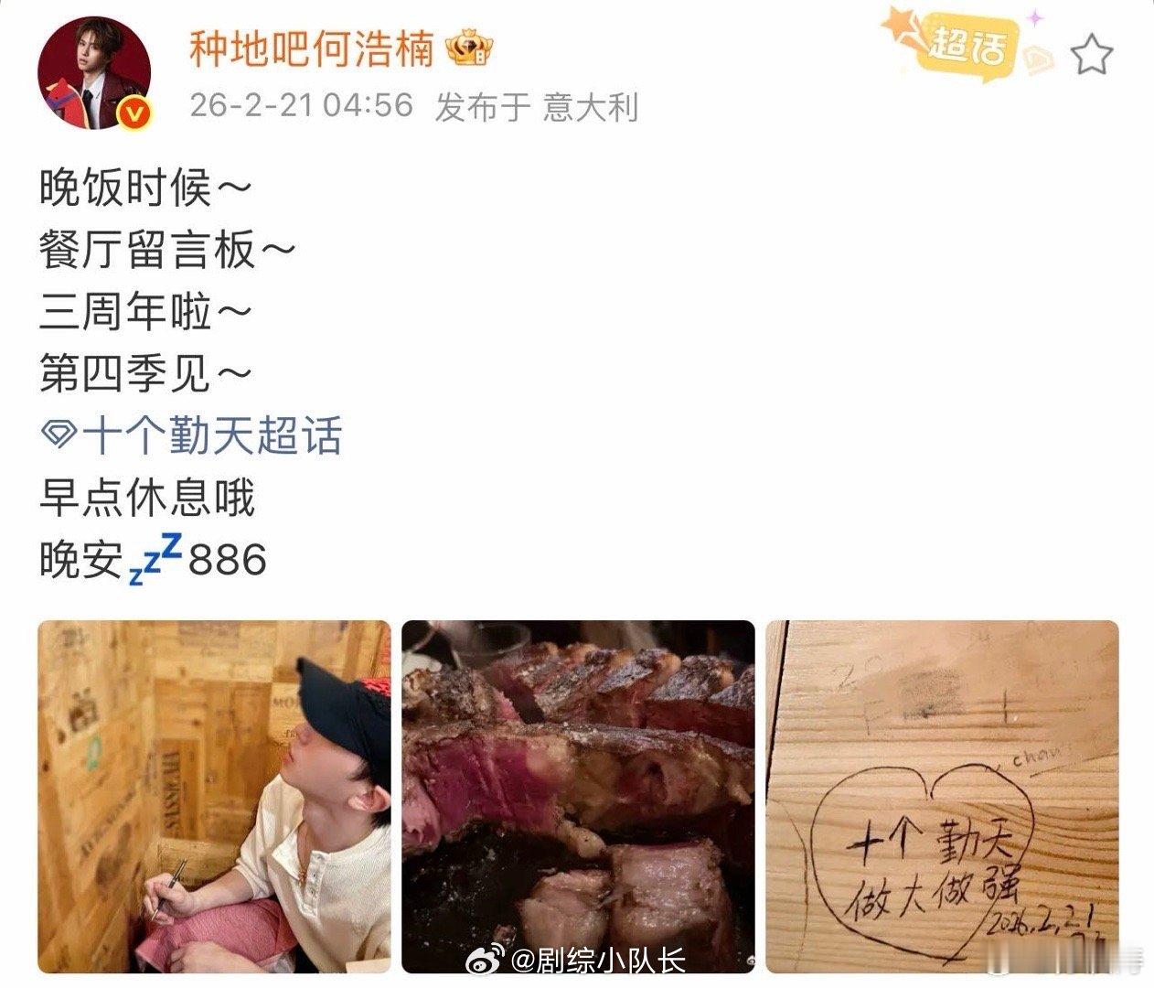 何浩楠出国五天发几十条报备微博 置顶报备博实时更新,IP变了第一时间提醒,等行李要拍一张,吃饭要拍一张,连当地零食都不放过——何浩楠的分享欲真的刻进DNA了!