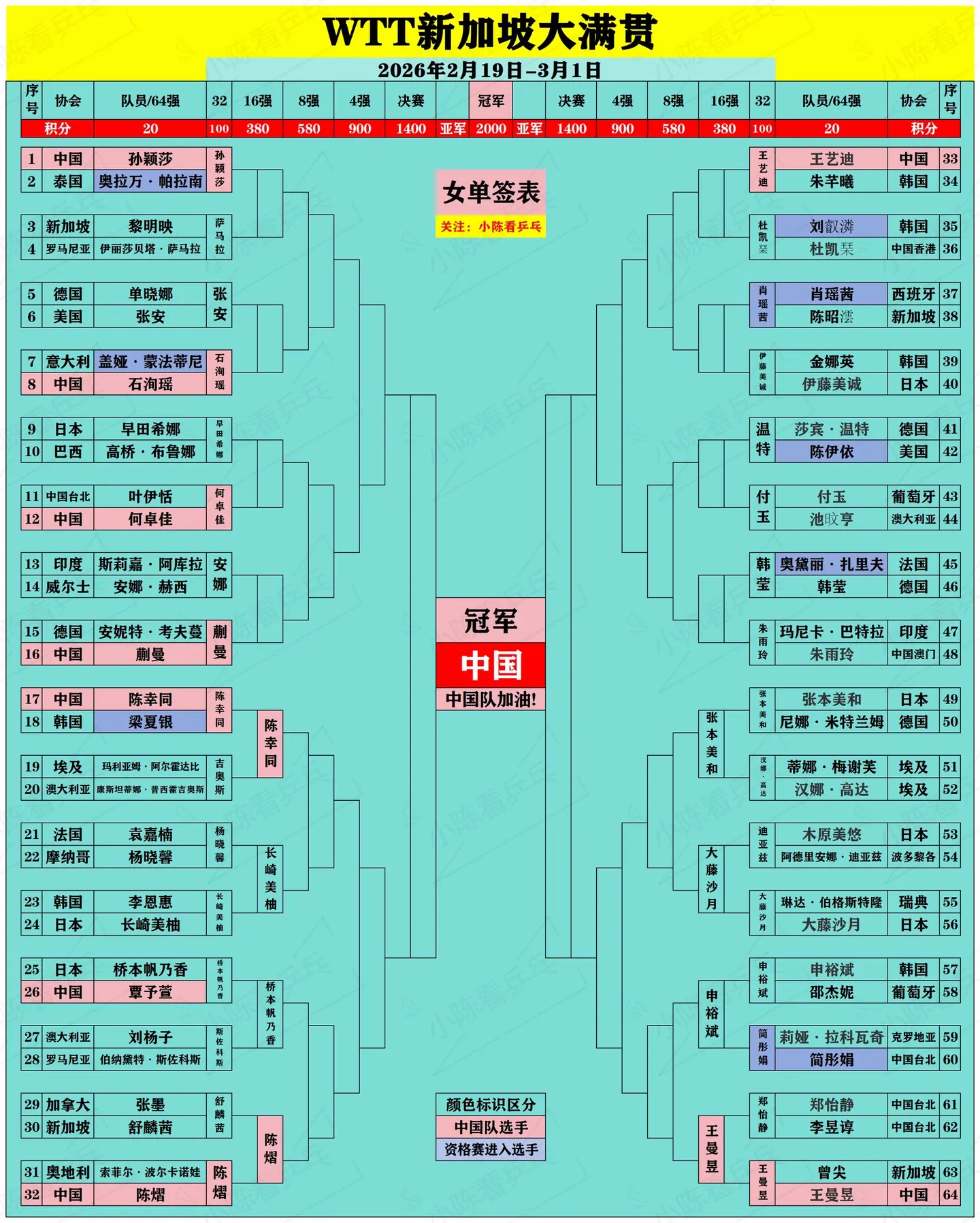 WTT新加坡大满贯签位图更新2月25日。WTT新加坡大满贯签位图更新2...