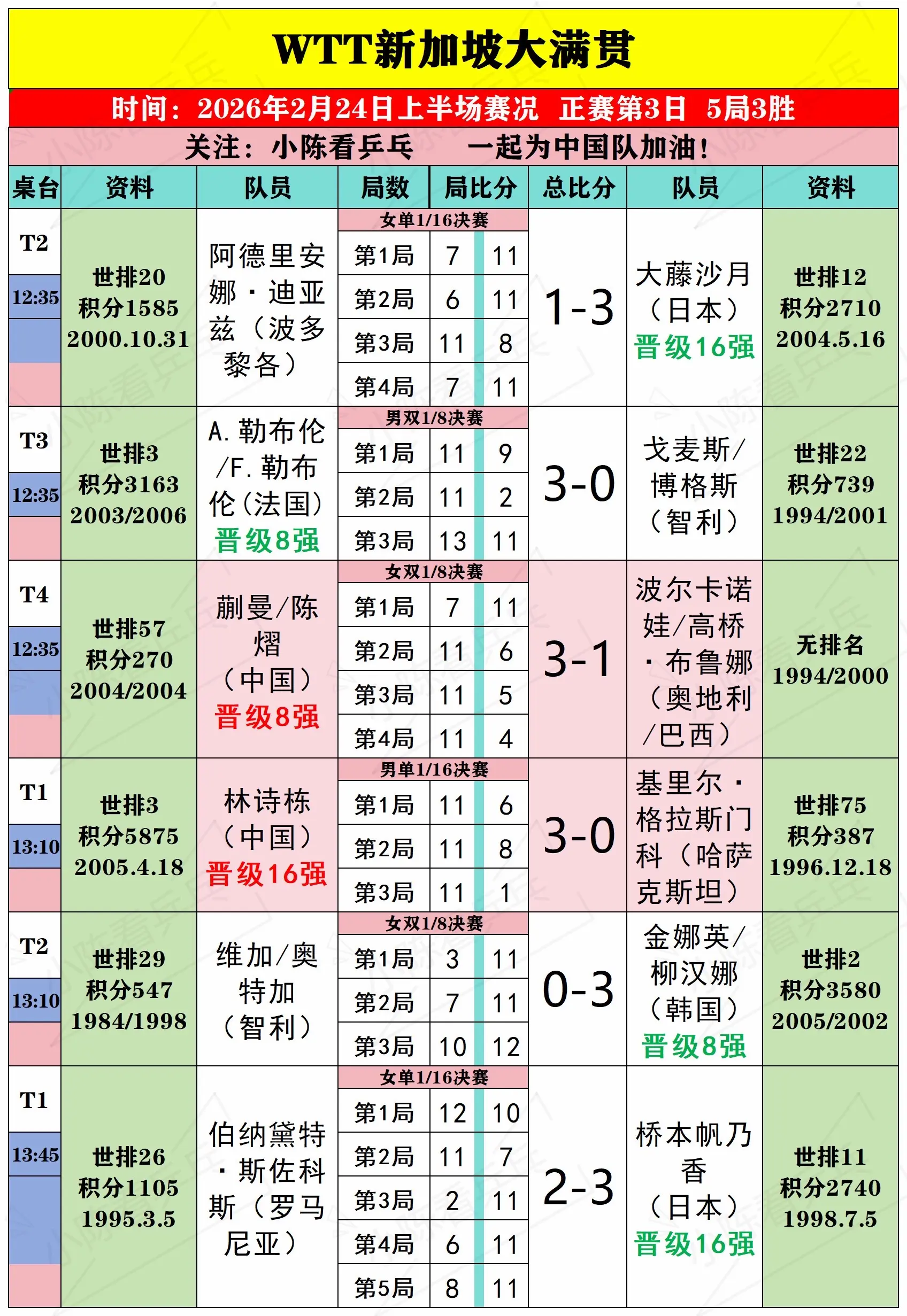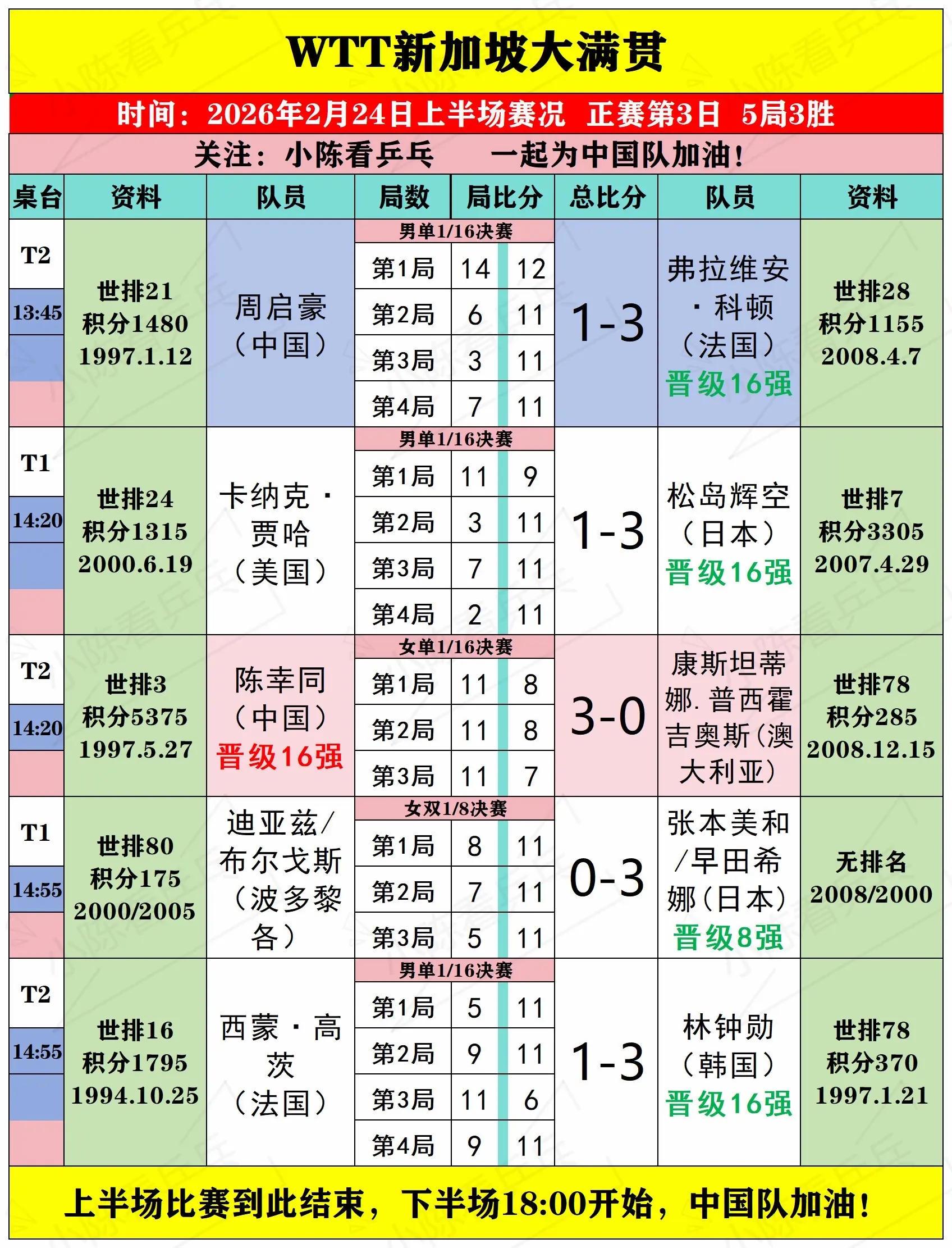 WTT新加坡大满贯2月24日上半场赛况。WTT新加坡大满贯2月24日上...