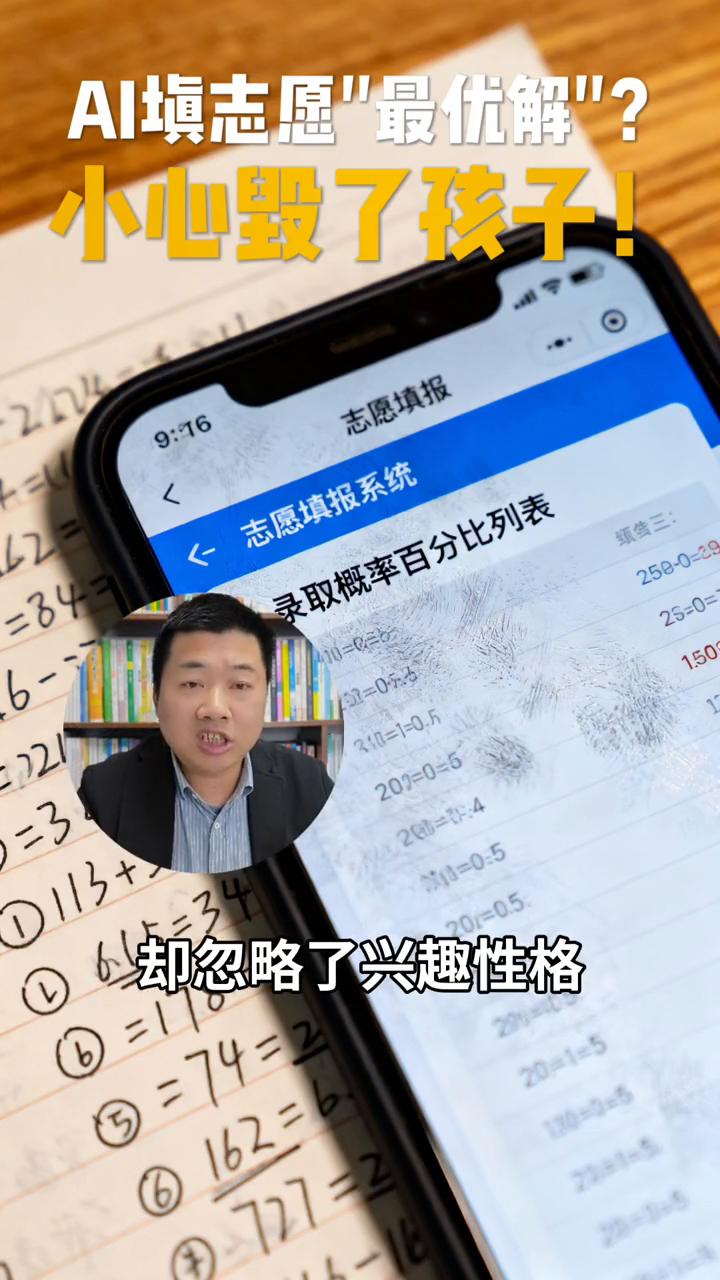 AI填志愿"最优解"?小心毁了孩子! 家人们,今天必须聊聊志愿填报这大事儿。每年寒假回访考生,我感触太深了。就说西安财经大学投资学的小王,学习社团两不误,对专业那叫一个热爱。可她寝室另外两个同学用AI填资源,结果惨了。这两个同学入学才半年,每天上课像坐牢,学习动力全没了,作业敷衍,未来一片迷茫。 现在唯一的希望就是转专业,可竞争激烈,还得补休学分,压力山大,天天自我怀疑。为啥会这样?AI虽能处理海量数据,算录取概率又快又准,但它有致命盲区,读不懂人心。这两个同学的志愿方案只考虑了分数和学校层级,却忽略了兴趣、性格、潜能这些关键维度。算法能告诉你能上啥学校,却不知道你适不适合,更预判不了你会不会因为不喜欢而痛苦。 那咋办?我作为本途教育生涯规划师,给大家提个醒,用数据+经验+人文关怀的三维决策模型。我们在咨询中会深度访谈,挖掘孩子内心想法,用科学测评验证兴趣性格,还会家庭访谈,协调家庭期望和孩子意愿。就像小王,她选专业不仅看分数,更因为热爱金融,所以大学走得坚定又从容。 选专业本质是选生活方式。很多家长以为消除信息差就能填好志愿,真正要避开的是认知差,得了解孩子和专业。分数匹配不算啥,生涯适配才关键。在这个AI时代,咱更得回归教育本质,关注孩子个体差异。 家长们,你家孩子填志愿会依赖AI吗?AI和人工规划,你觉得最大区别是啥?评论区聊聊,让更多家长少走弯路。欢迎关注本途生涯,了解升学规划,选择本途,规划前途。