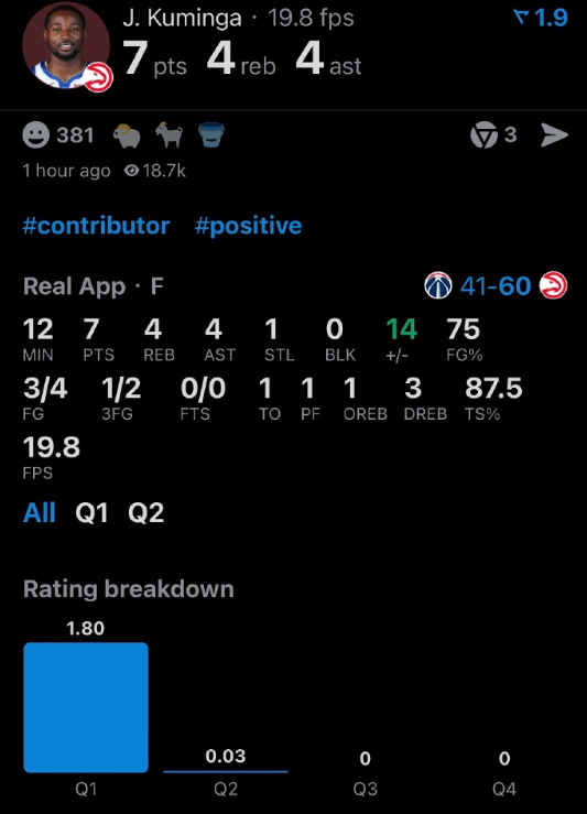 库明加半场出战12分钟,4投3中,7分4板4助攻1抢断,全面数据,厉害了。