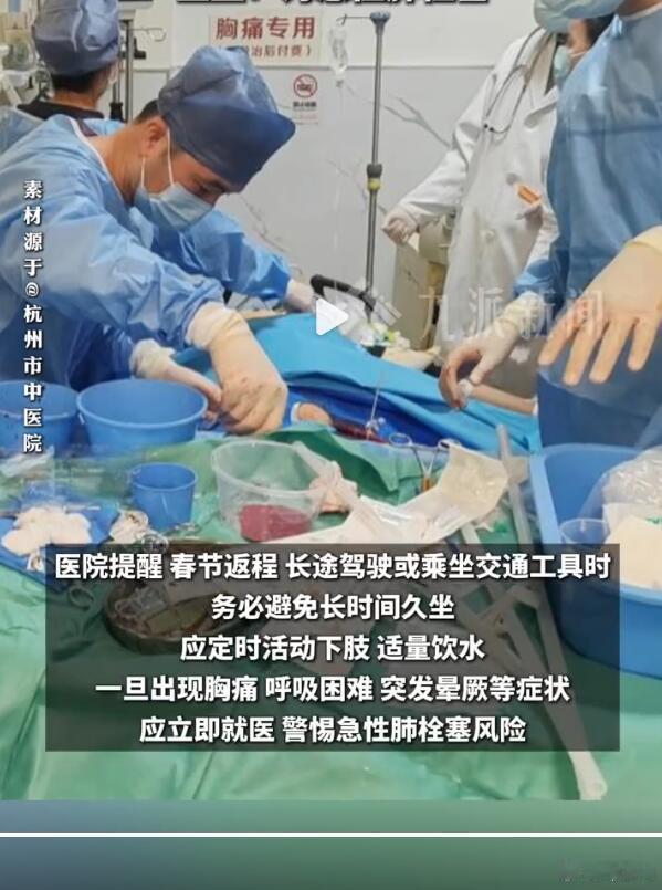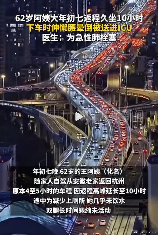 这个情况,大家一定要注意,不管是上岁数的还是年轻人,久坐都有可能导致下肢深静脉血栓,这是很危险的,如果血栓脱落了,进入肺部或者心脏,那就是急性梗塞。再加上现在很多人吃外卖,非常油腻,就容易血脂偏高,也会导致血栓的形成,千万别因为自己年轻就觉得OK。坐的时间长了,就起来活动一下,30分钟起来踢踢腿、原地跳跳就可以了。健康还是要掌握在自己的手里呀…..62岁阿姨返程堵车久坐19小时进ICU62岁阿姨返程堵车久坐19小时进ICU下肢深静脉血栓