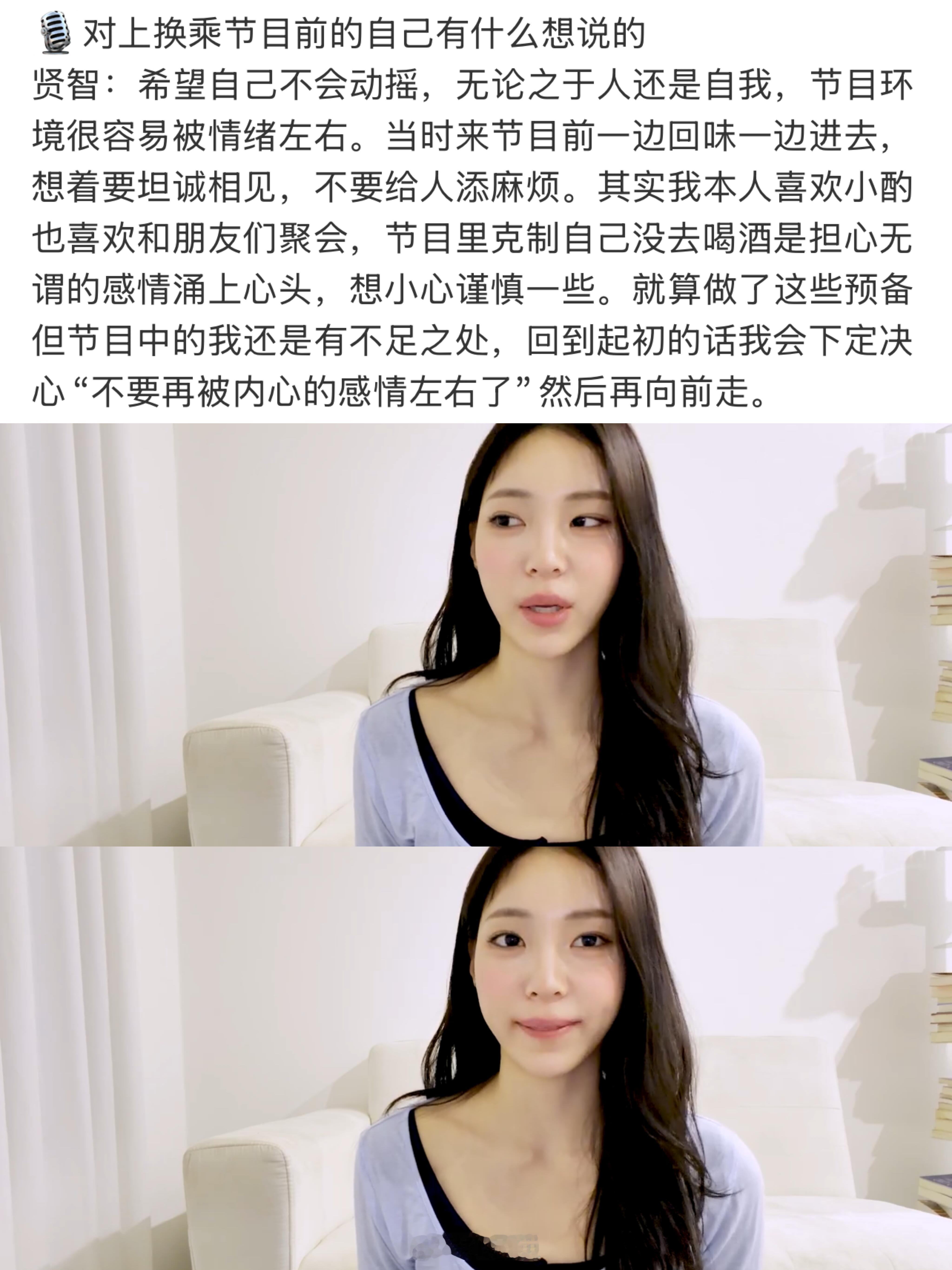 贤智对换乘前自己说的话🥺姐真的很清醒啊贤智新vlog记录了一些Q&A[哇R]当被问道对节目前自己想说的话贤智希望自己不要被情绪牵着走 可以清醒明白心意这也是克制自己没有和大家一起🍺的原因但回看节目发现自己表现仍有不足 如果回到起初会再告诉自己不要被情感而左右[皱眉R][皱眉R]看下来这期vlog也算是一种反思 感到姐真的是头脑清醒的人 能够对自己的想法和表现有明确的认识[点赞R]也真的很喜欢贤智的日常照(像猫咪哈哈)p4这样素素的就很好看!镜头有的时候把一群大美女拍成了小美女[暗中观察R]
