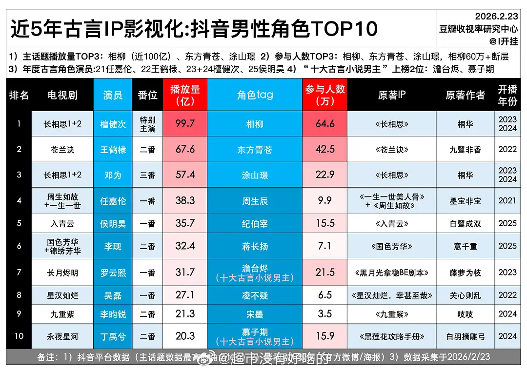 近5年古言IP影视化:男性角色抖播放量排名檀健次相柳至今还是断层的存在