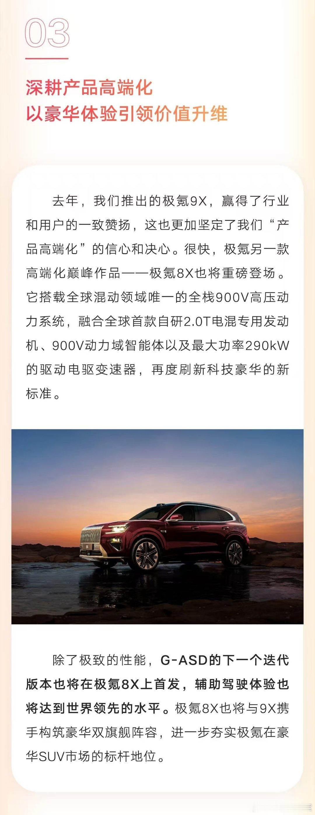 经历9X之后,极氪打造豪华旗舰的思路已经越来越清晰。高性能旗舰的极氪8X,定位上接棒大哥9X,价格应该会到45万起。同样基于SEA-S架构打造,不仅搭载同款超级电混动力系统、零百加速或将达 2 秒级,更沿用了9X同款底盘,旗舰级核心配置直接拉满。如今更官宣首发新一代千里浩瀚G-ASD辅助驾驶技术,更是如虎添翼。9X上的G-ASD已展现超强实力,SmartAIAgent架构带来类人驾驶体验,把“高含模量”的优势发挥得淋漓尽致,新一代版本落地8X,势必让其竞争力再攀新高,双旗舰阵容威慑力拉满。极氪8X将首发新一代辅助驾驶技术