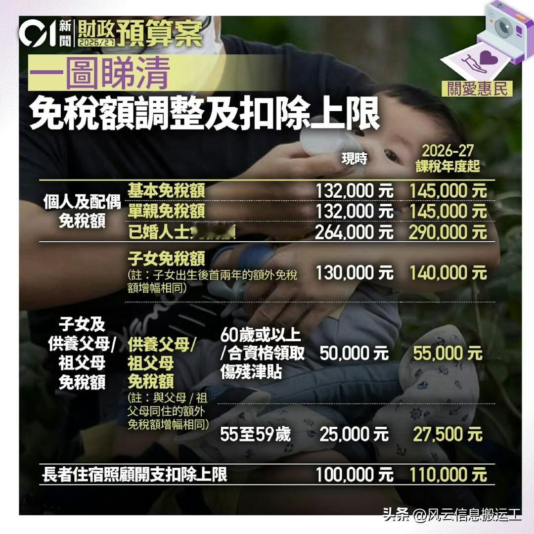 香港打工人最新免税额 基本及单亲免税额由13.2万元增至14.5万元 已婚人士免税额由26.4万元增至29万元 子女免税额及额外子女免税额由13万元增加至14万元 供养60岁或以上父母或祖父母的免税额由5万元增加至5.5万元 供养55至59岁的父母或祖父母的免税额,由2.5万元增至2.75万元 父母或祖父母入住合资格院舍、长者住宿照顾开支的扣除上限由10万元增加至11万元 来源香港“CI 新闻”(香港01)