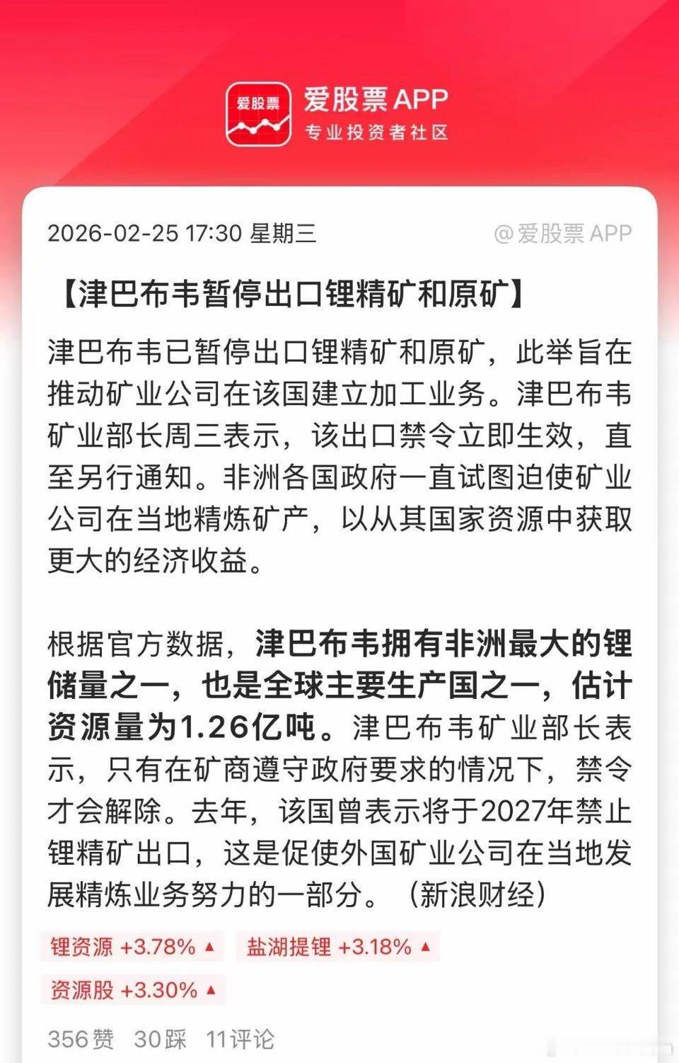 今晚锂矿行业一个利好,津巴布韦宣布立即暂停所有锂矿的出口。该国约占全球锂供给10%,影响还是蛮大的!