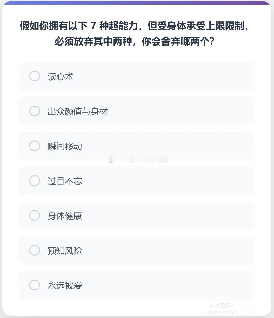 假如你拥有以下 7 种超能力,但受身体承受上限限制,必须放弃其中两种,你会舍弃哪两个?1.读心术2.出众颜值与身材3.瞬间移动4.过目不忘5.身体健康6.预知风险7.永远被爱