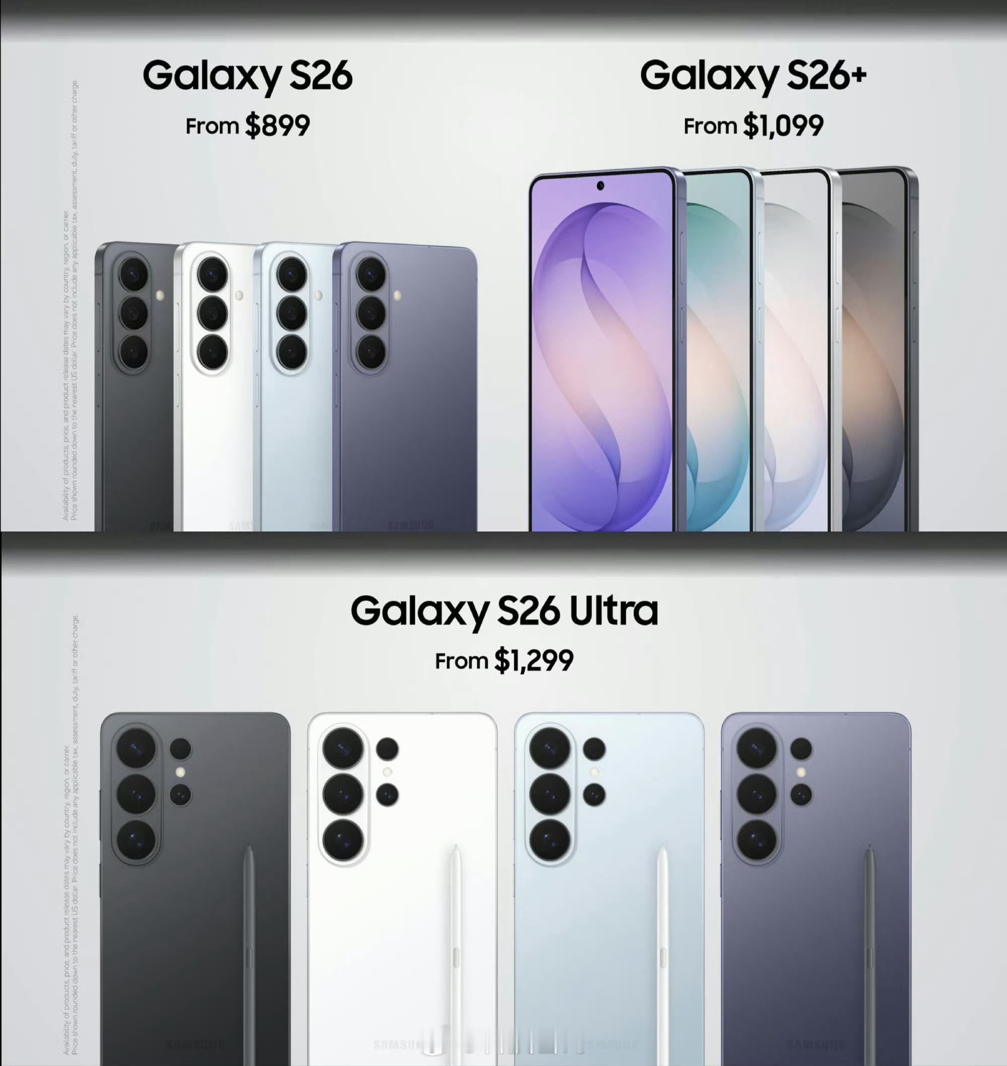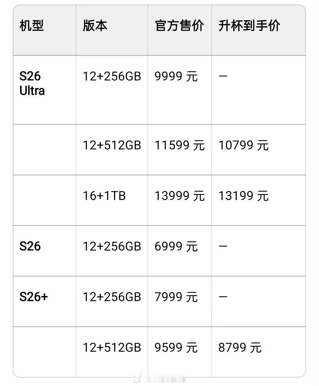 三星GalaxyS26系列价格三星Galaxy S26系列正式发布,6999元起~ 三星Galaxy S26: 6.3英寸 2340*1080 120Hz AMOLED屏,搭载第五代骁龙8至尊版 for Galaxy处理器后置50MP主摄+10MP 3X长焦+12MP超广角25W有线充+15W无线充+4300mAh电池搭载One UI 8.5,支持若干全新AI功能搭载超声波指纹,支持USB 3.2 Gen1IP68防尘防水 12+256GB:6999元。三星Galaxy S26+: 6.7英寸 3120*1440 120Hz AMOLED屏, 搭载第五代骁龙8至尊版 for Galaxy处理器后置50MP主摄+10MP 3X长焦+12MP超广角45W有线充+20W无线充+4900mAh电池IP68防尘防水、 12+256GB:7999元,12+512GB:9599元三星Galaxy S26 Ultra:6.9英寸 3120*1440 120Hz AMOLED屏,三星首款隐私防窥屏,支持手动开启搭载第五代骁龙8至尊版 for Galaxy处理器后置200MP主摄+10MP 3X长焦+50MP 5X长焦+50MP超广角60W有线充+25W无线充+4900mAh电池IP68防尘防水,厚7.9mm,重214g。 12+256GB:9999元,12+512GB:11599元 16GB+1TB:13999元。