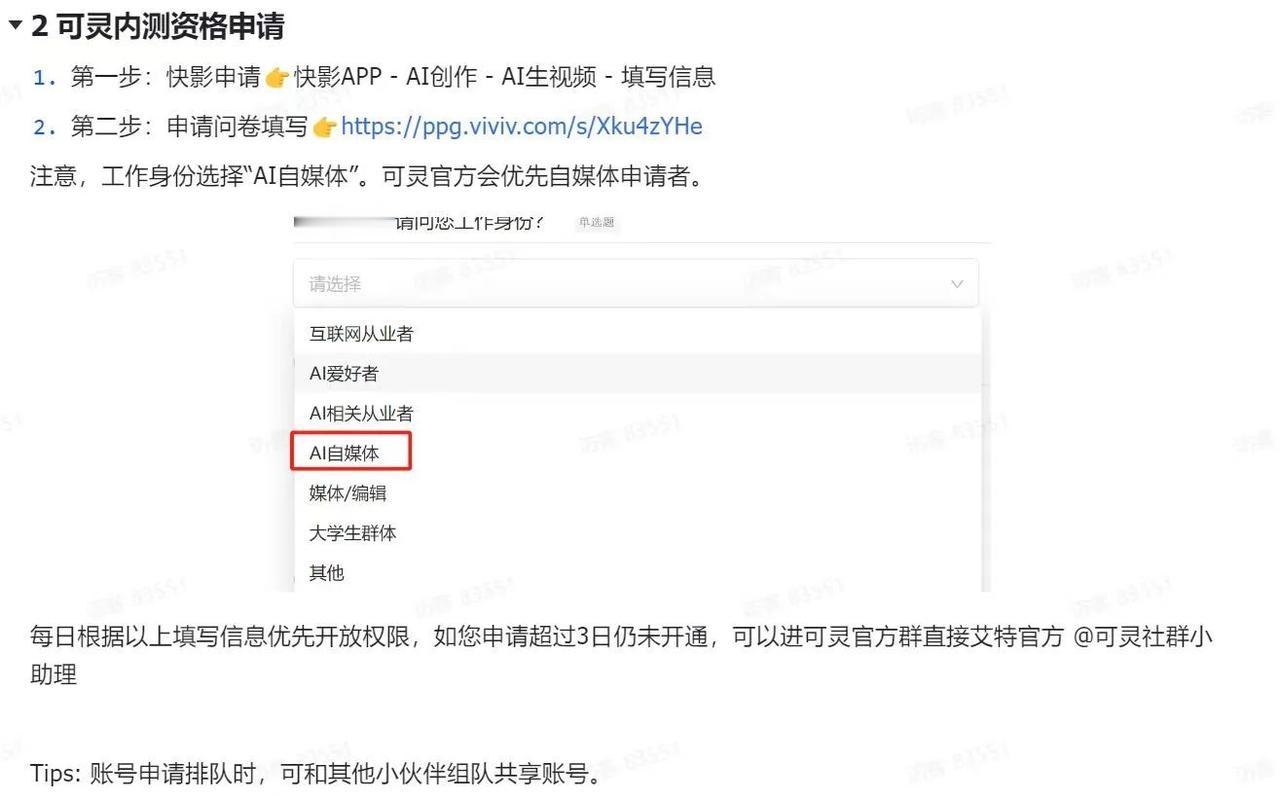 快手可灵AI网页版震撼上线 ! 很多人还没快手-可灵的账号,这里先告诉大家怎么申请? 消息来自官方测试群,可灵ai目前要填写问卷加速,地址: 「可灵AI」Web端平台及全新功能上线!立即体验Web端: