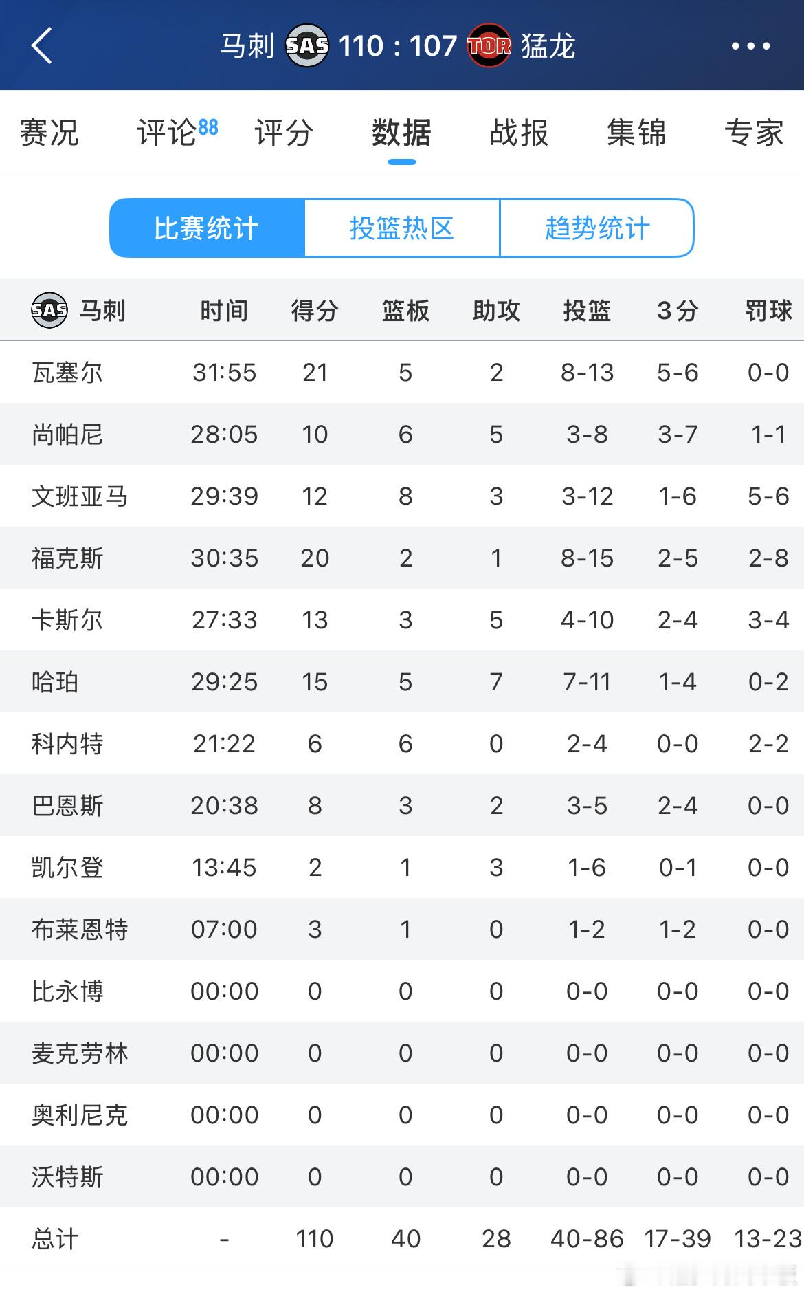 文班亚马12分8板3助5封盖马刺vs猛龙