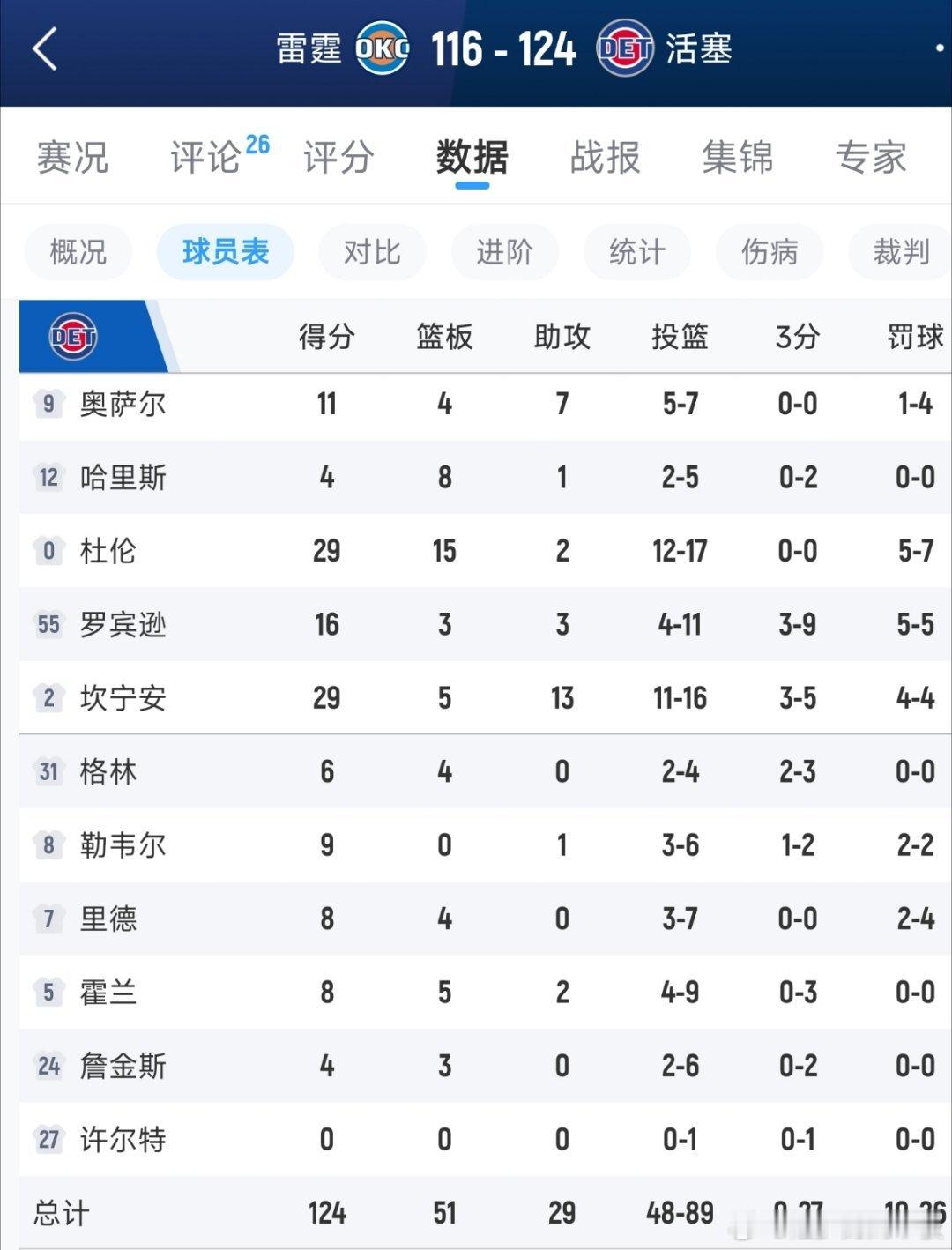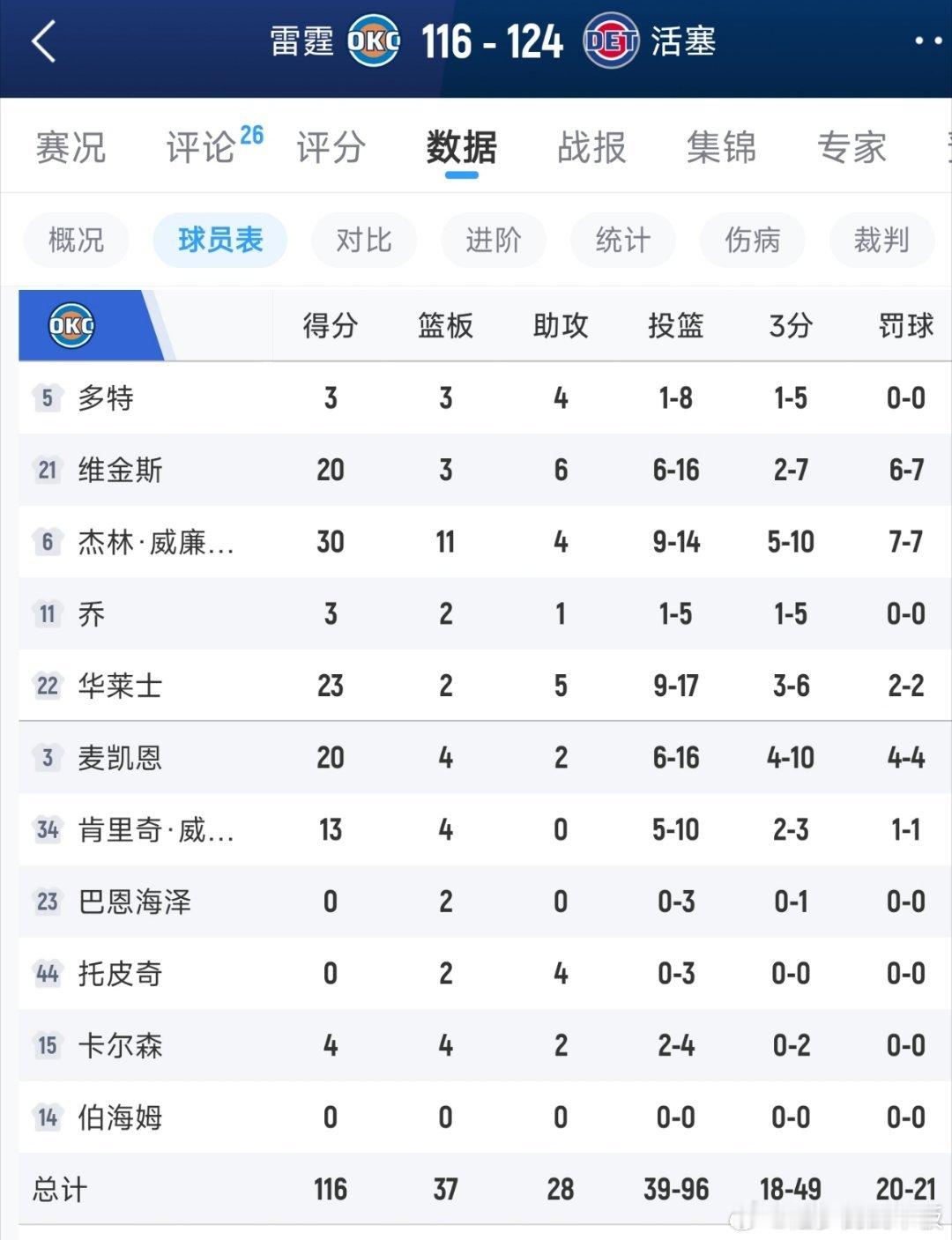 坎宁安29分5板13助,杜伦29分15板;雷霆多名主力缺席,杰林-威廉姆斯30分11板雷霆vs活塞