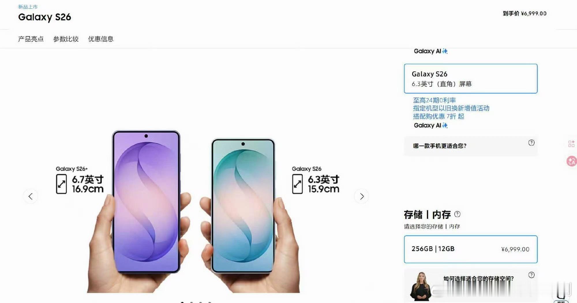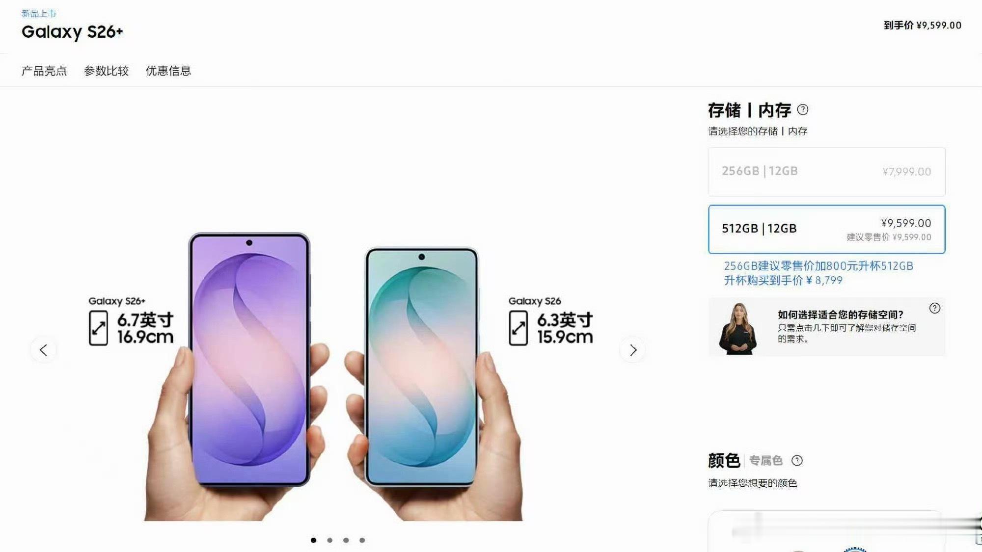 Galaxy S26+12GB+256GB: 7999 元12GB+512GB:9599 元(256GB 版本可以加 800 元“升杯”至 512GB,实际到手价 8799 元)。