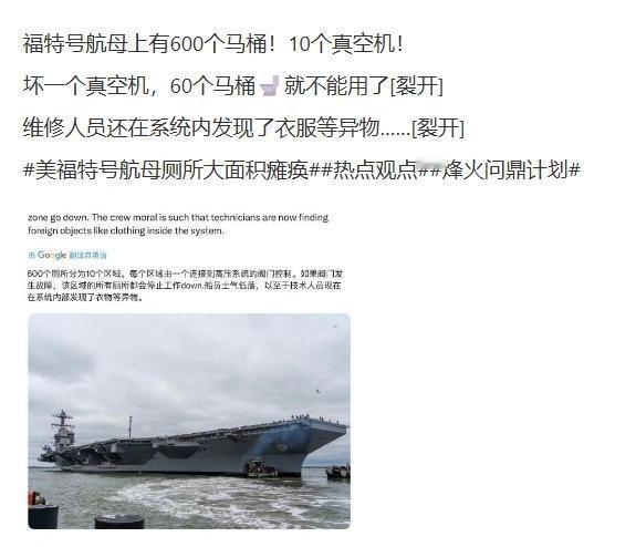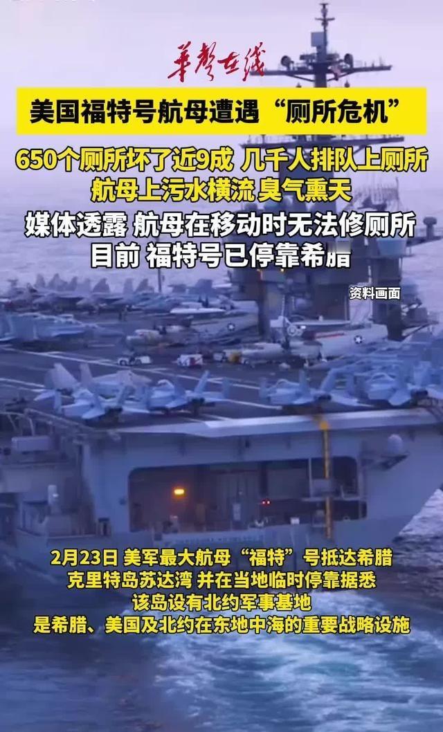 这次福特号厕所被堵,污水横流的原因基本可以确定是福特号超期部署导致的,轻一点说就是水兵发泄不满情绪,重一点直接可以定性为哗变了! 福特号是美国海军现役最贵、最新的航母,2017年服役,排水量10万吨出头,电磁弹射、先进拦阻装置这些新技术堆了一堆,本来指望它当下一代主力,结果从服役开始就各种问题缠身。2025年6月24日从诺福克出发,这次部署一开始是去地中海巡航,后来秋天转到加勒比海,参与了对委内瑞拉的军事施压行动,直接导致委内瑞拉前领导人被捕。整个部署拖到2026年2月,已经超过200天,远远超出美军航母常规7个月左右的周期。 海军作战部长考德尔上将在2026年1月表面海军协会年会上直接放话,说他反对再延长福特号的部署时间。他讲得很清楚,超期对舰员身心健康、家庭关系、士气打击太大,对舰体本身磨损也严重,后面的维护计划全得往后推。考德尔这话不是随便说说,他其实是在给高层施压,意思是别把一艘航母当永动机使唤。结果部署还是没停,福特号继续硬扛。 2月23日,福特号突然紧急停靠希腊克里特岛的苏达湾美军基地。原因就是舰上的真空粪便收集系统彻底崩了。福特级为了省水,用的是负压抽吸的窄管系统,跟尼米兹级那种重力冲水的集中式厕所完全不一样。尼米兹级厕所多是集中大间,好几百人共用几套大管道,结构简单,出问题概率低。福特号为了适应性别多样化政策,把居住舱改成每舱40人左右的小单元,每个小舱都有独立卫生间,管路变得超级复杂,分支多、接头多、阀门多,一旦哪一段卡住,整片区域就瘫痪。 舰上厕所总数大概650个,这次坏掉接近九成,能用的那几个前排队要等四五十分钟。社交媒体上流传的视频和照片显示,走廊里污水到处流,维修队只能人工清理。工程记录显示,四天内故障报了205次,维修小组连轴转19小时,用高浓度酸洗管道,每轮花几十万美元。部分舰员跟家人聊天时提到,有人故意把衣服、拖把头、垃圾袋之类的东西扔进马桶,导致堵塞加剧。这已经不是单纯的技术故障,而是人为因素占了很大比重。 为什么偏偏在这个节点爆雷?核心还是超期部署把人逼到极限。长期高强度任务、补给跟不上、基本生活条件崩坏,舰员每天面对的压力不是一般人能扛的。美军历史上类似案例不少:1989年衣阿华号炮塔爆炸,调查一度指向个别水兵蓄意破坏;2008年乔治·华盛顿号火灾后舰员生活恶劣,一年内多起自杀;2020年好人理查德号被纵火,直接退役。这些事都指向一个点——长期超负荷部署容易让不满情绪变成破坏行为。福特号这次堵厕所,规模不算大,但性质类似,就是用最简单、最恶心的方式表达抗议。轻说是不满发泄,重说就是小规模哗变,因为它直接影响全舰卫生和作战能力。 美国有11艘航母,除了已经在印度洋的林肯号,其他10艘为什么非要让已经累成狗的福特号继续顶?表面上看是中东局势紧张,需要双航母威慑,但实际上暴露了美军兵力捉襟见肘的现实。其他航母要么在维护,要么在轮换,要么刚从红海回来修,整支舰队可用性远没有宣传的那么高。福特号这种“带病坚持”成了常态,代价就是舰员和装备双双透支。