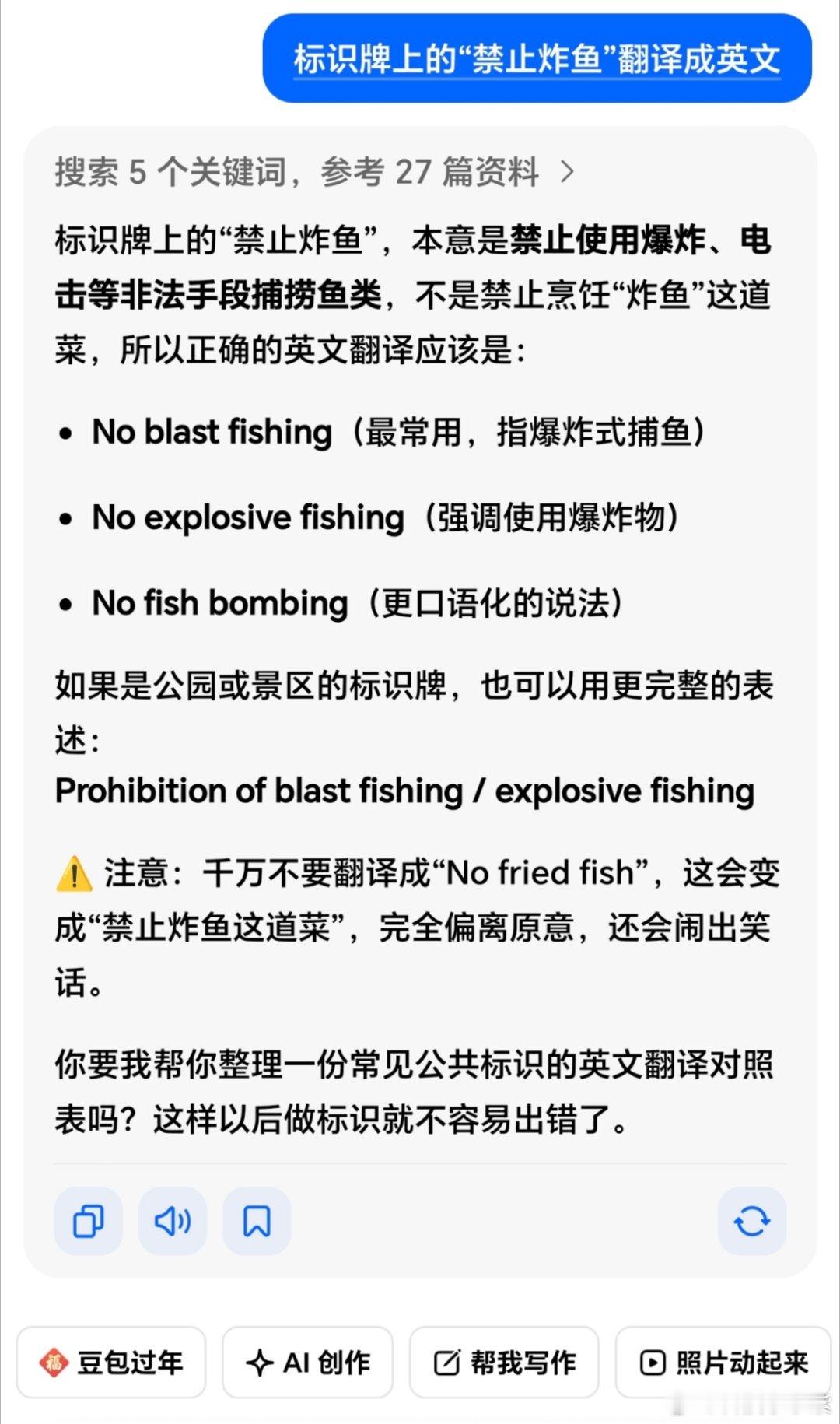 公园禁止炸鱼被误译为禁止油炸鱼现在AI这么强,自己不会翻译可以问AI呀!不然翻译错了招笑是小事,要是搞错了意思误导外国友人咋办?