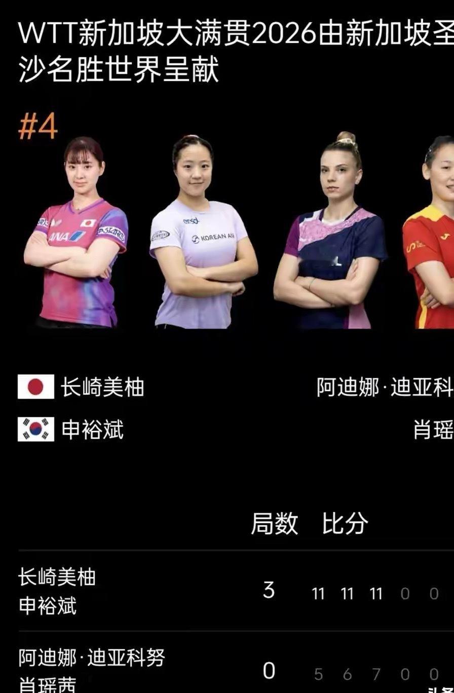 2月26日,WTT新加坡大满贯女双半决赛中,韩国选手申裕斌与日本选手长崎美柚组成的日韩组合,以3-0的比分横扫罗马尼亚与西班牙的跨国组合阿迪娜·迪亚克努/肖瑶茜,率先晋级决赛。这也让即将冲击冠军的国乒组合陈熠/蒯曼面临不小的压力。