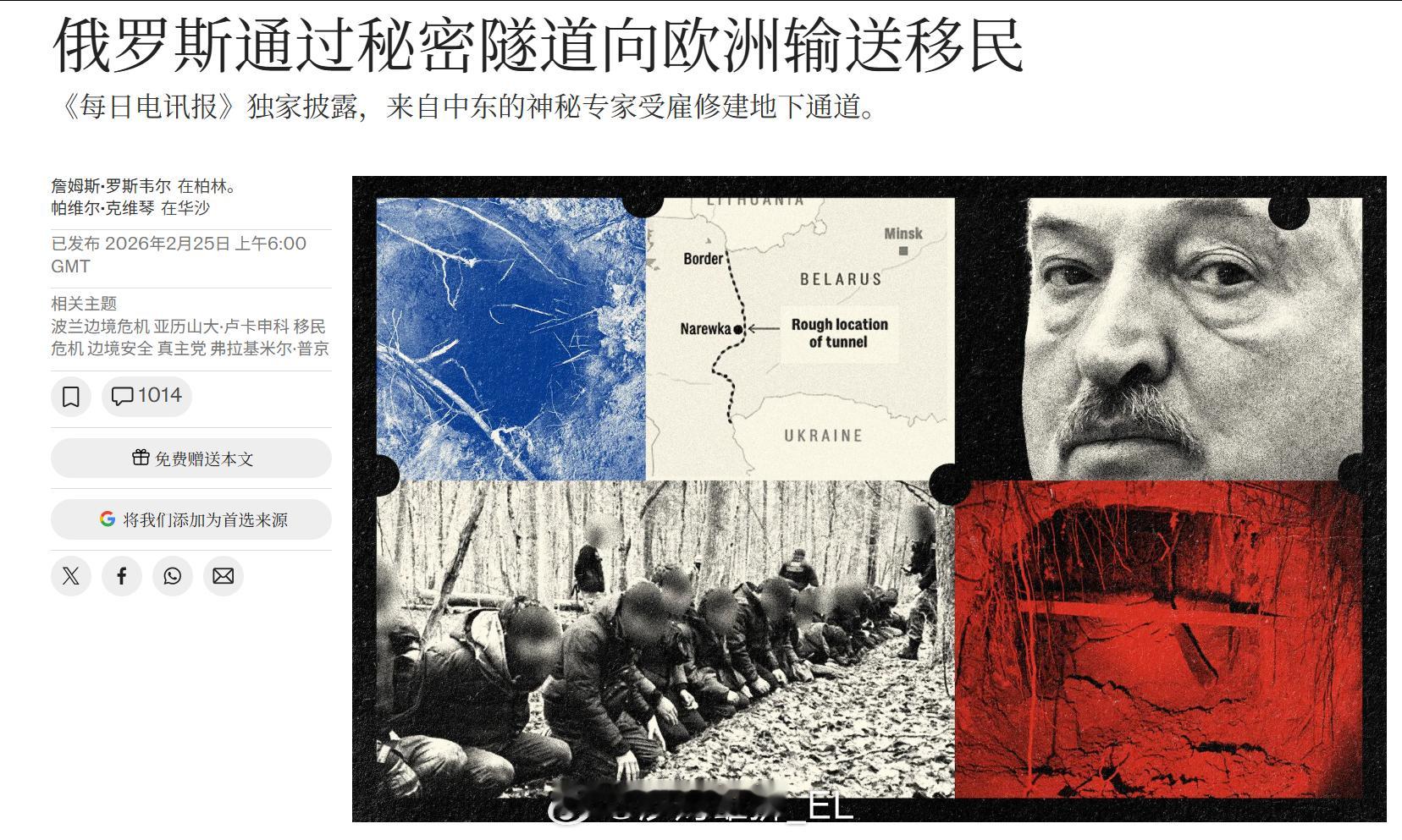英国《电讯报》声称,俄罗斯和白俄罗斯利用地道将难民偷运到欧盟国家。