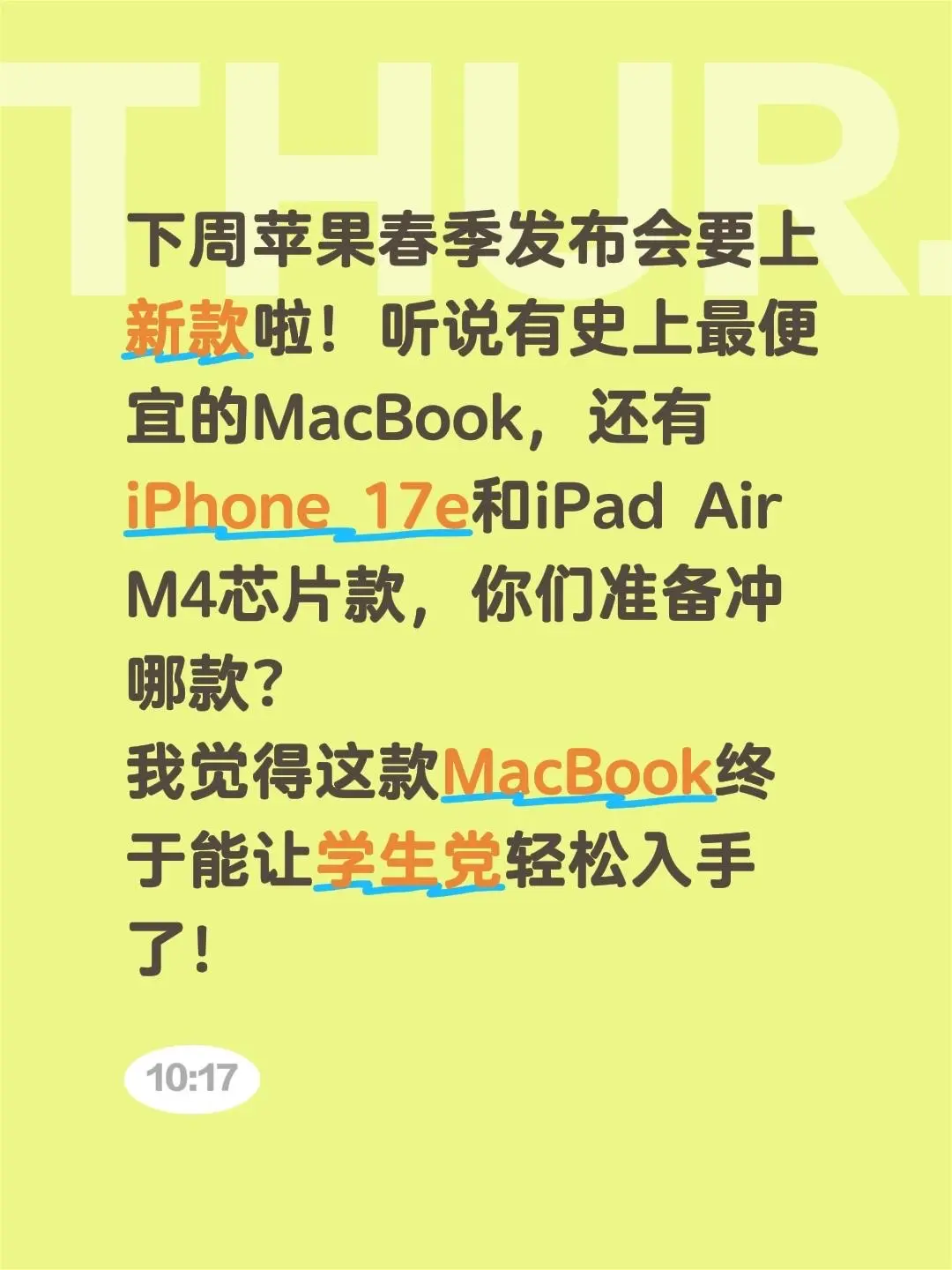 苹果春季发布会下周来了。下周苹果春季发布会要上新款啦!听说有史上最便宜的MacBook,还有iPhone 17e和iPad Air M4芯片款,你们准备冲哪款?