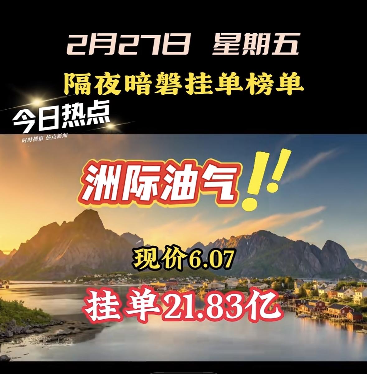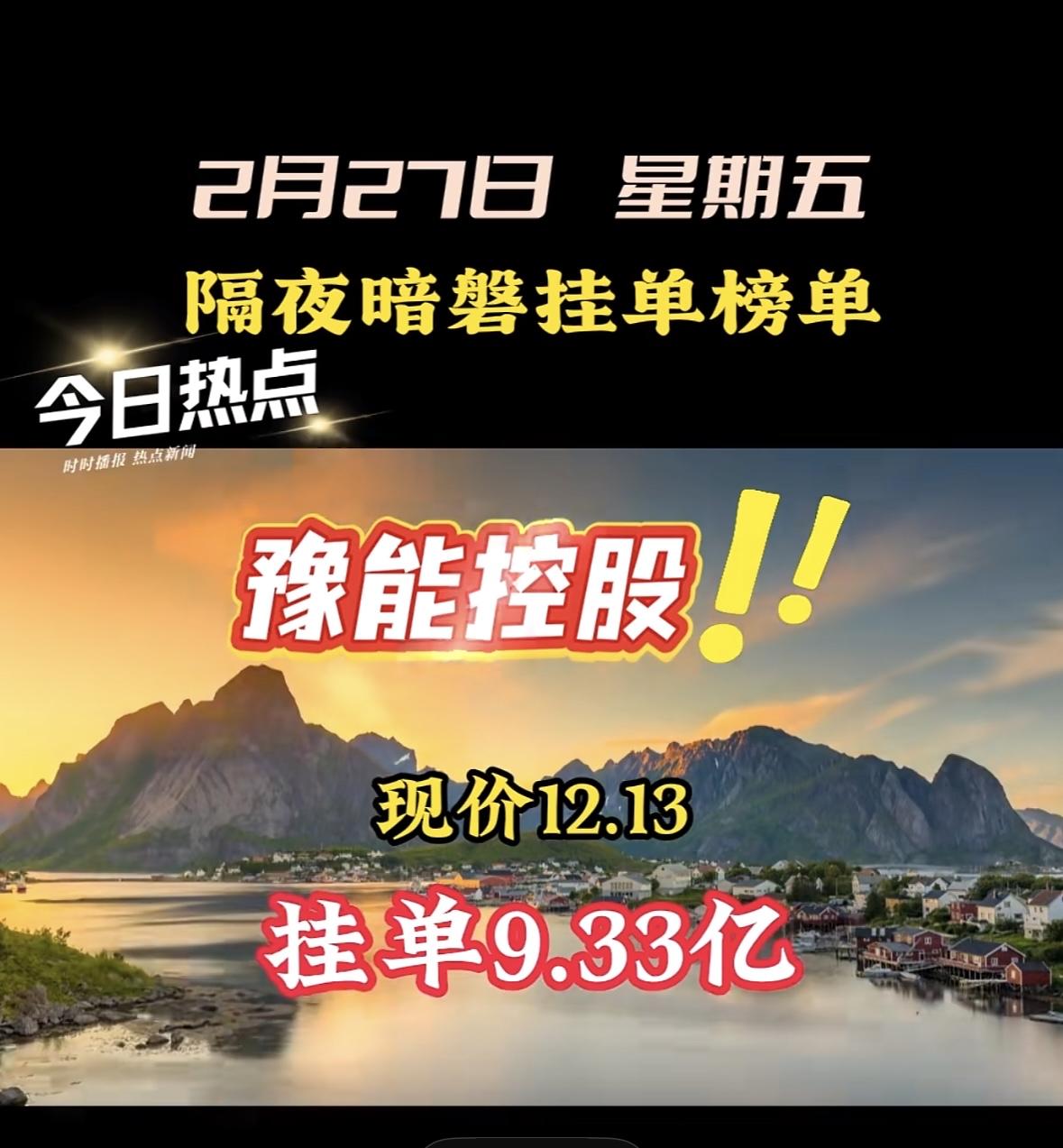2月27日隔夜暗盘挂单榜单,豫能控股现价12.13,挂单9.33亿!