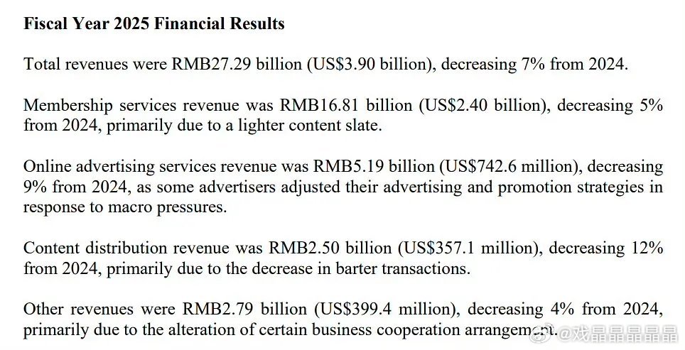 按业务来看,2025年全年,会员服务收入168.1亿元,较2024年下降5%;在线广告服务收入51.9亿元,较2024年下降9%;内容分发收入25亿元,较2024年下降12%;其他收入27.9亿元,较2024年下降4%。