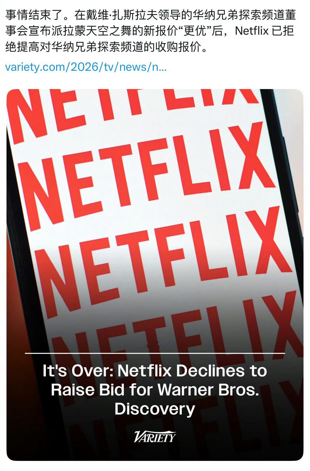 派拉蒙将报价提高至每股31美元后,网飞决定放弃收购华纳兄弟!