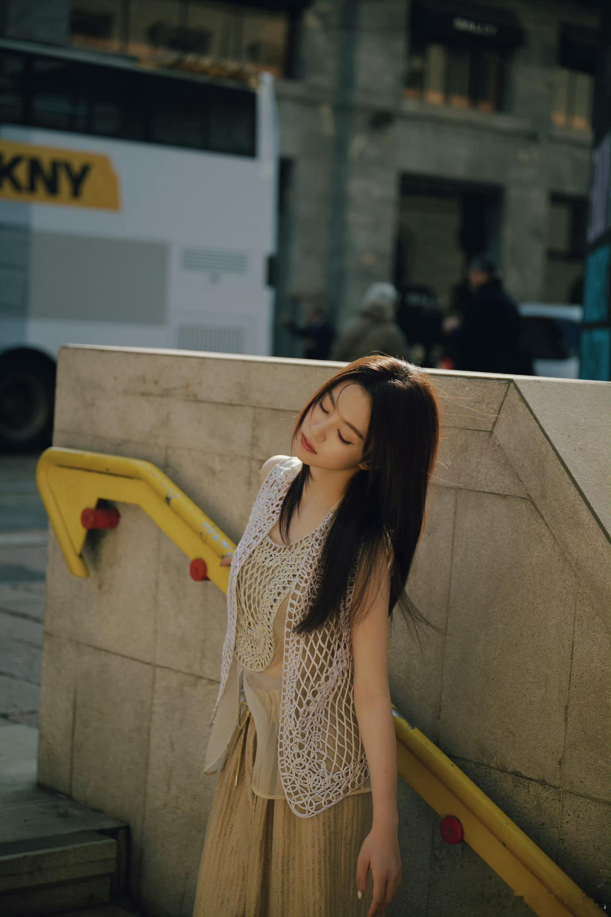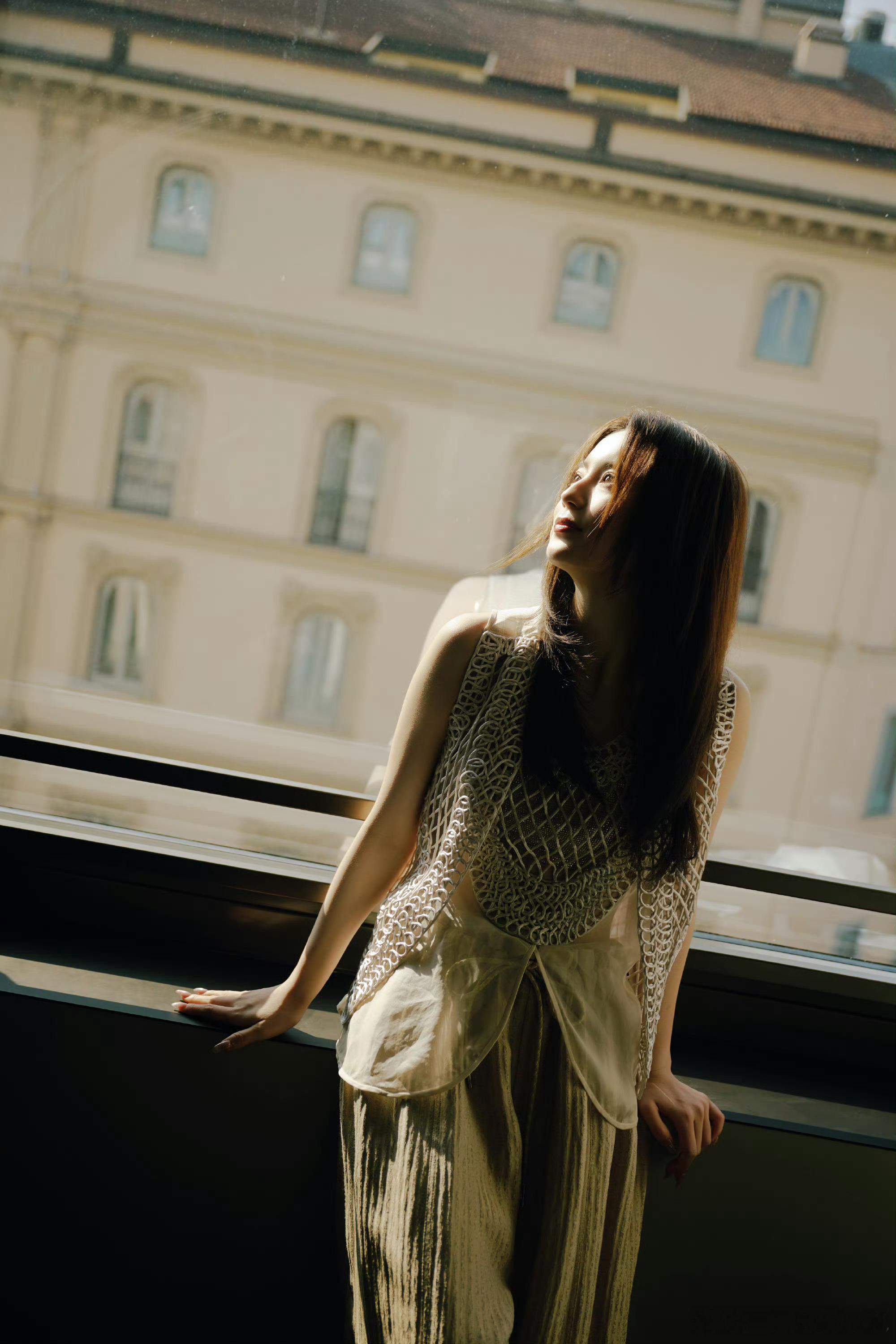 李一桐木格窗漏进的月光把亮片裙织成流动的河她斜倚在朱红的栏上发梢垂落,像