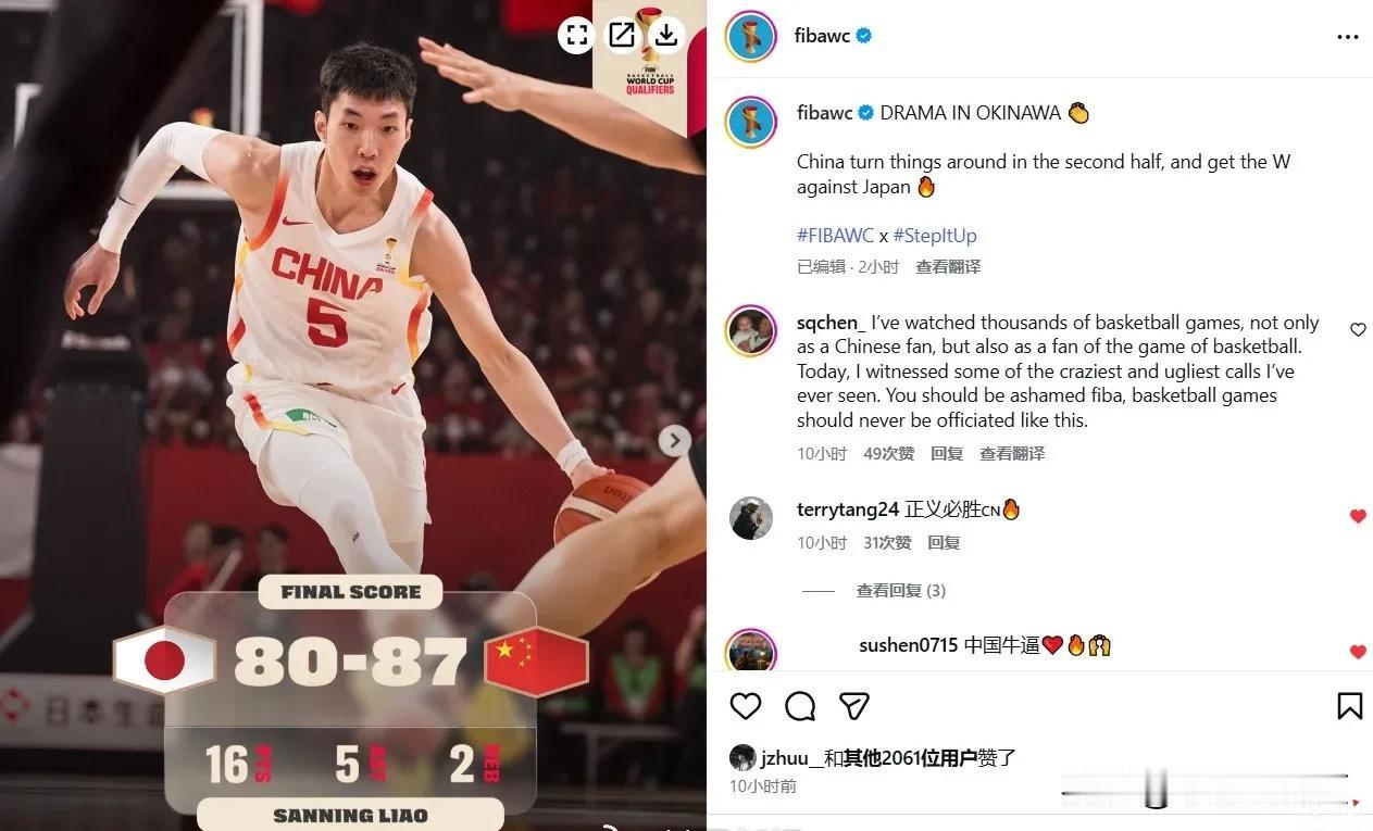 FIBA官方社媒称“中国男篮偷走胜利”评论区翻车 官方紧急改文案 FIBA称中国男篮“偷走胜利”引众怒,官方紧急改文案 在男篮世界杯亚洲区预选赛第二窗口期首战中,中国男篮客场挑战日本队。面对一度落后15分的不利局面,中国队下半场强势反击,最终以87比80逆转取胜。比赛末段,裁判多次不利吹罚增加比赛压力,但球队顶住考验,拿下关键胜利。 然而赛后,FIBA世界杯官方Instagram发布动态称:“冲绳神剧本!中国男篮从日本偷走一场胜利。”此番表述迅速引发轩然大波,评论区“翻车”。全球球迷纷纷抗议:“谁偷偷摸摸心里有数”“中国队赢得光明正大”“该查的是裁判,不是胜利者”。 舆论发酵后,FIBA迅速将原帖修改为:“冲绳神剧本!中国男篮在下半场翻盘,击败日本队。”虽仅一字之差,“偷走”变为“翻盘”,却体现对比赛尊重的回归。此次事件折射出国际体育传播中的话语权与公正性争议,也凸显中国男篮用实力赢得尊严的不易。中国男篮 男篮亚预赛 男篮亚洲预选赛