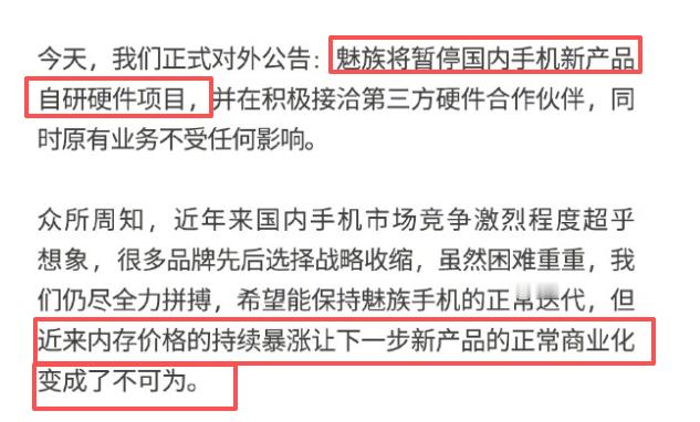 魅族手机3月正式退市 魅族科技今日宣布:魅族将暂停国内手机新品自研硬件项目,内存价格的持续暴涨让下一步新品的正常商业化变成了不可为。