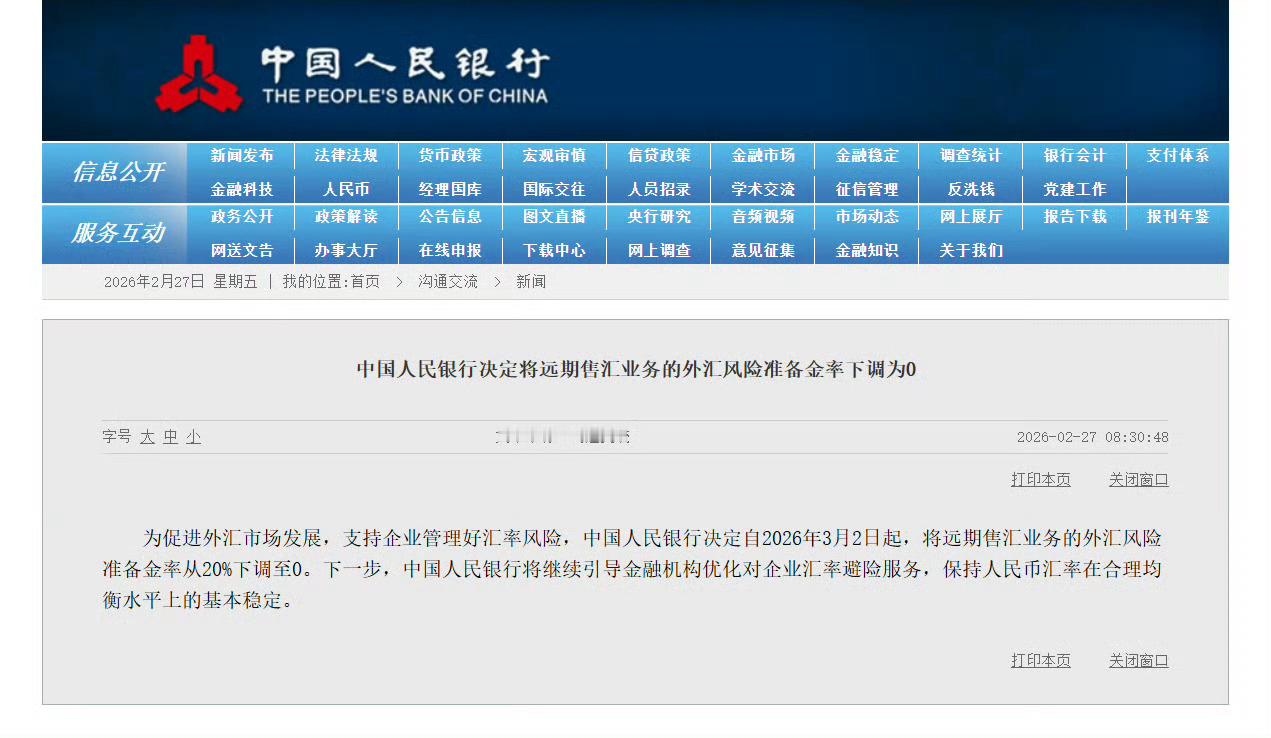 中国人民银行:为促进外汇市场发展,支持企业管理好汇率风险,中国人民银行决定自2026年3月2日起,将远期售汇业务的外汇风险准备金率从20%下调至0。