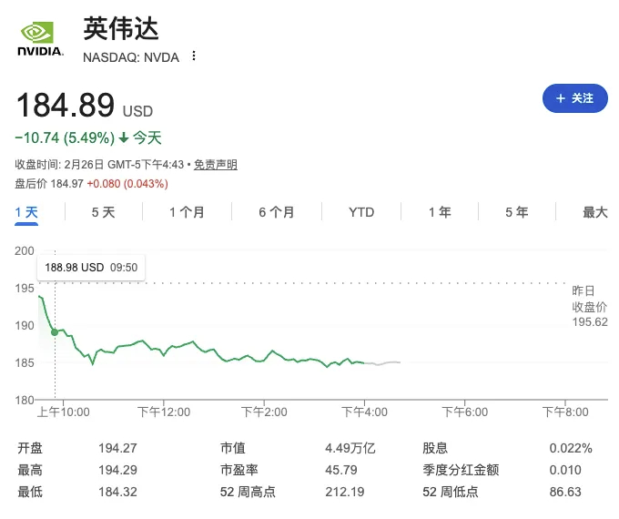 周四,英伟达股价在纽约一度下跌5.7%,至184.32美元,创下自11月25日以来最大的盘中跌幅,最终收跌5.49%,报184.89美元。