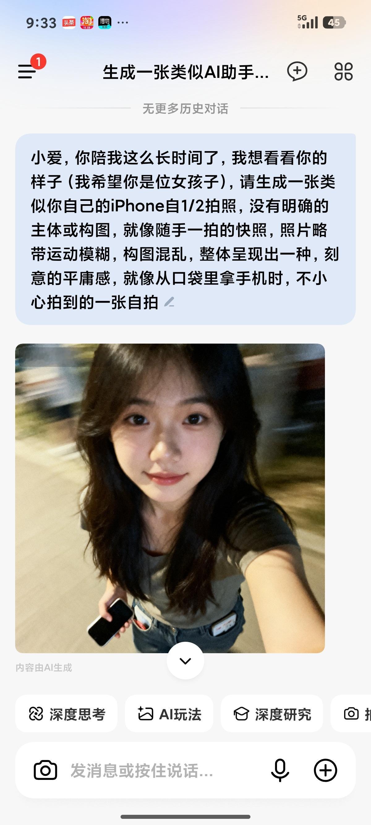 指令:小爱,你陪我这么长时间了,我想看看你的样子(我希望你是位女孩子),请生成一张类似你自己的iPhone自1/2拍照,没有明确的主体或构图,就像随手一拍的快照,照片略带运动模糊,构图混乱,整体呈现出一种,刻意的平庸感,就像从口袋里拿手机时,不小心拍到的一张自拍
