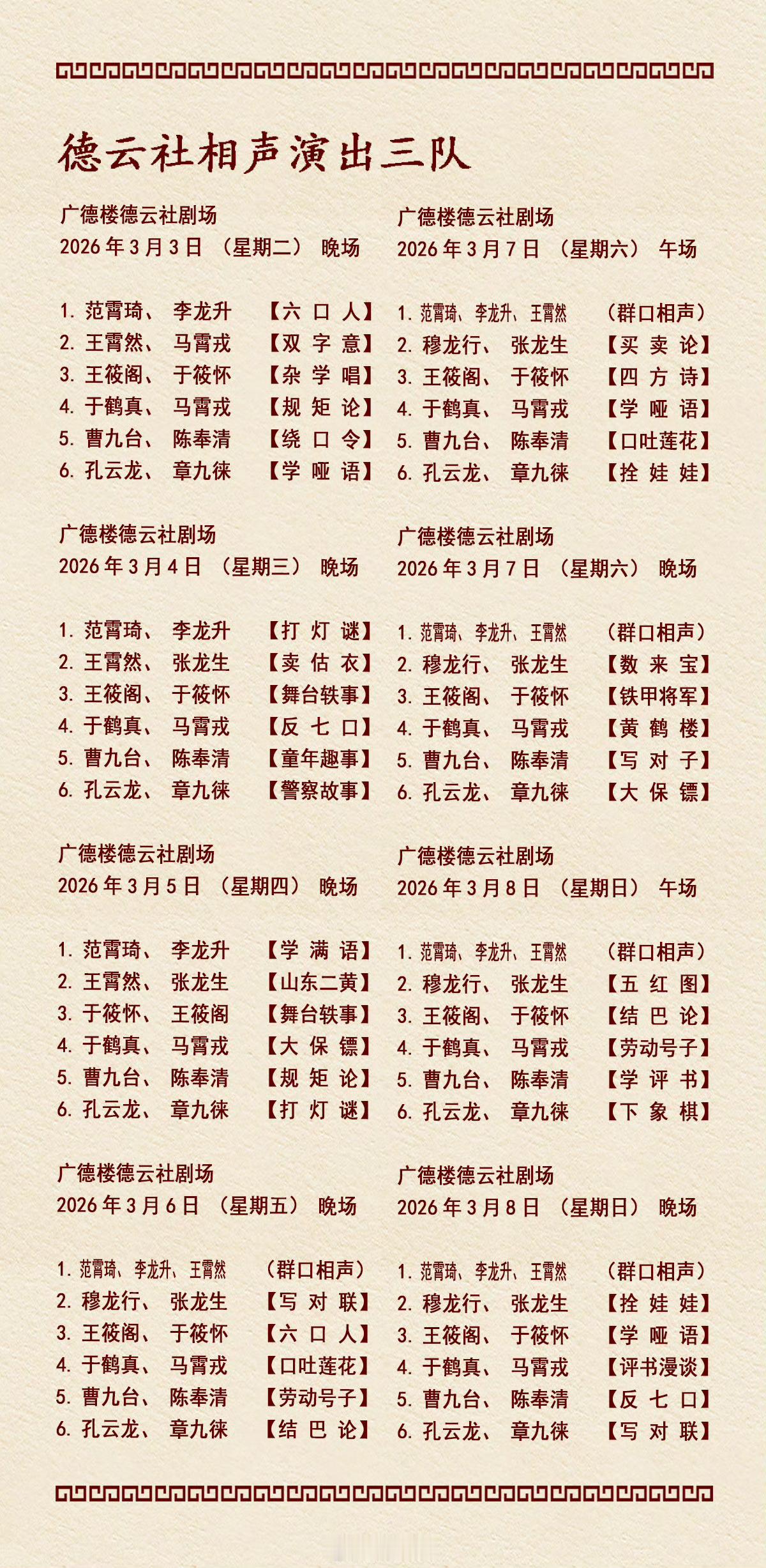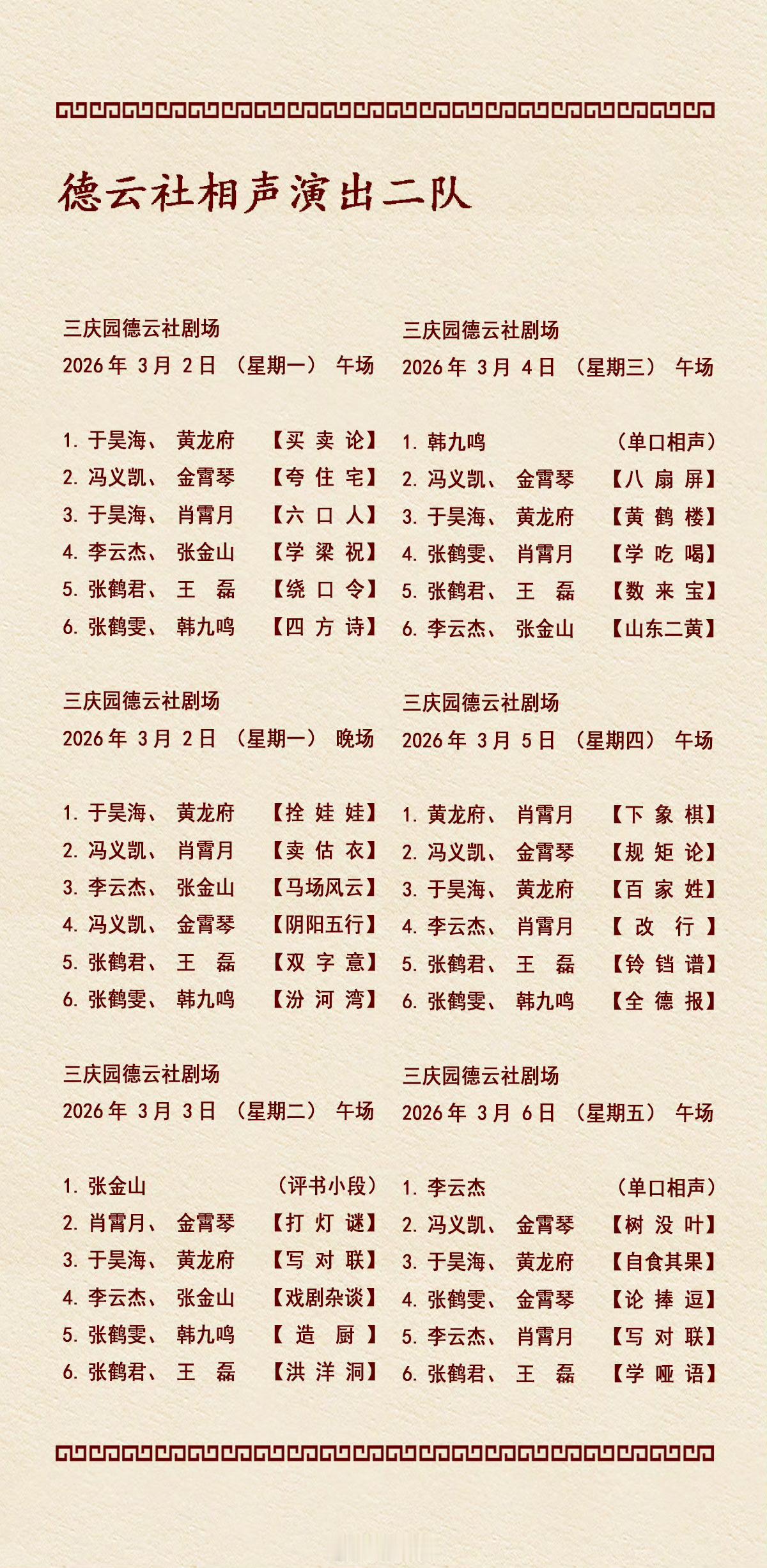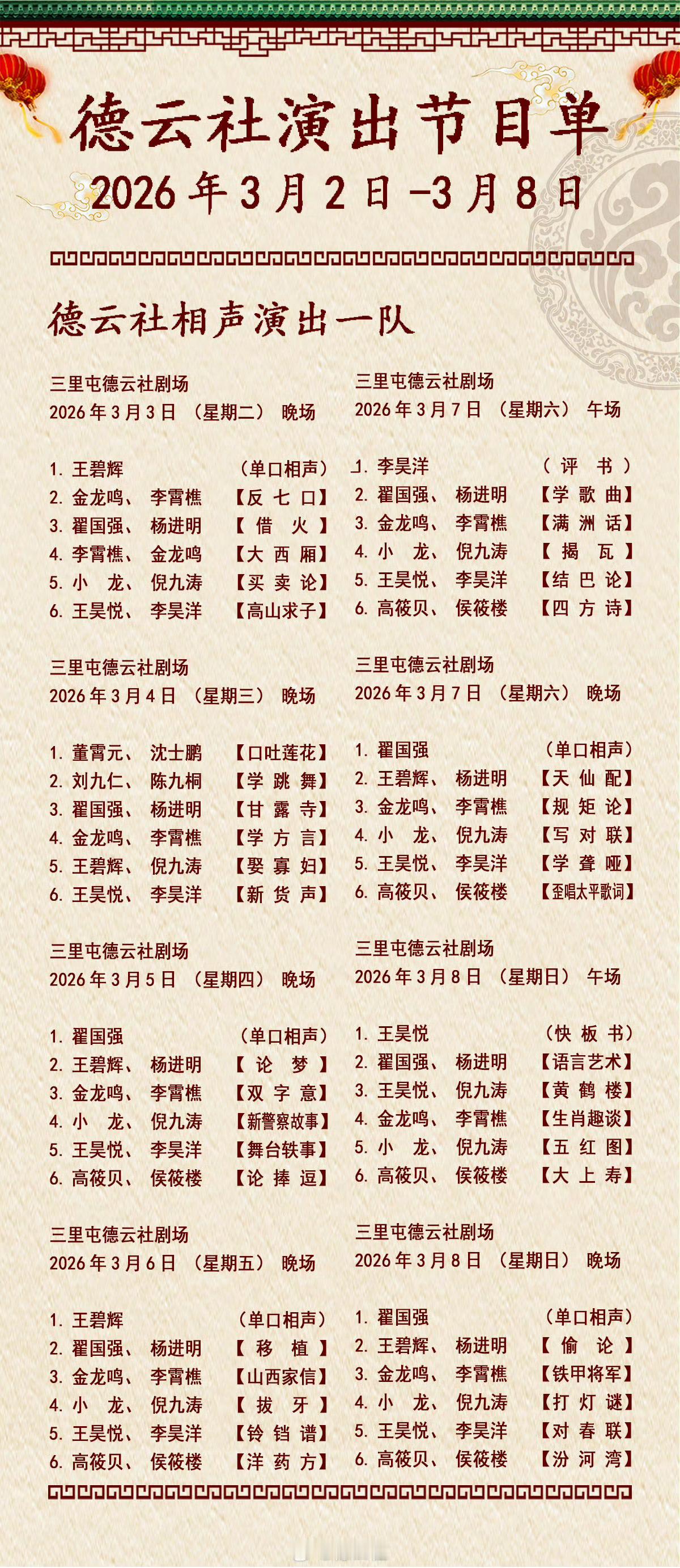 2026年3月2日-3月8日德云社各队演出节目单,有啥看点一起分享