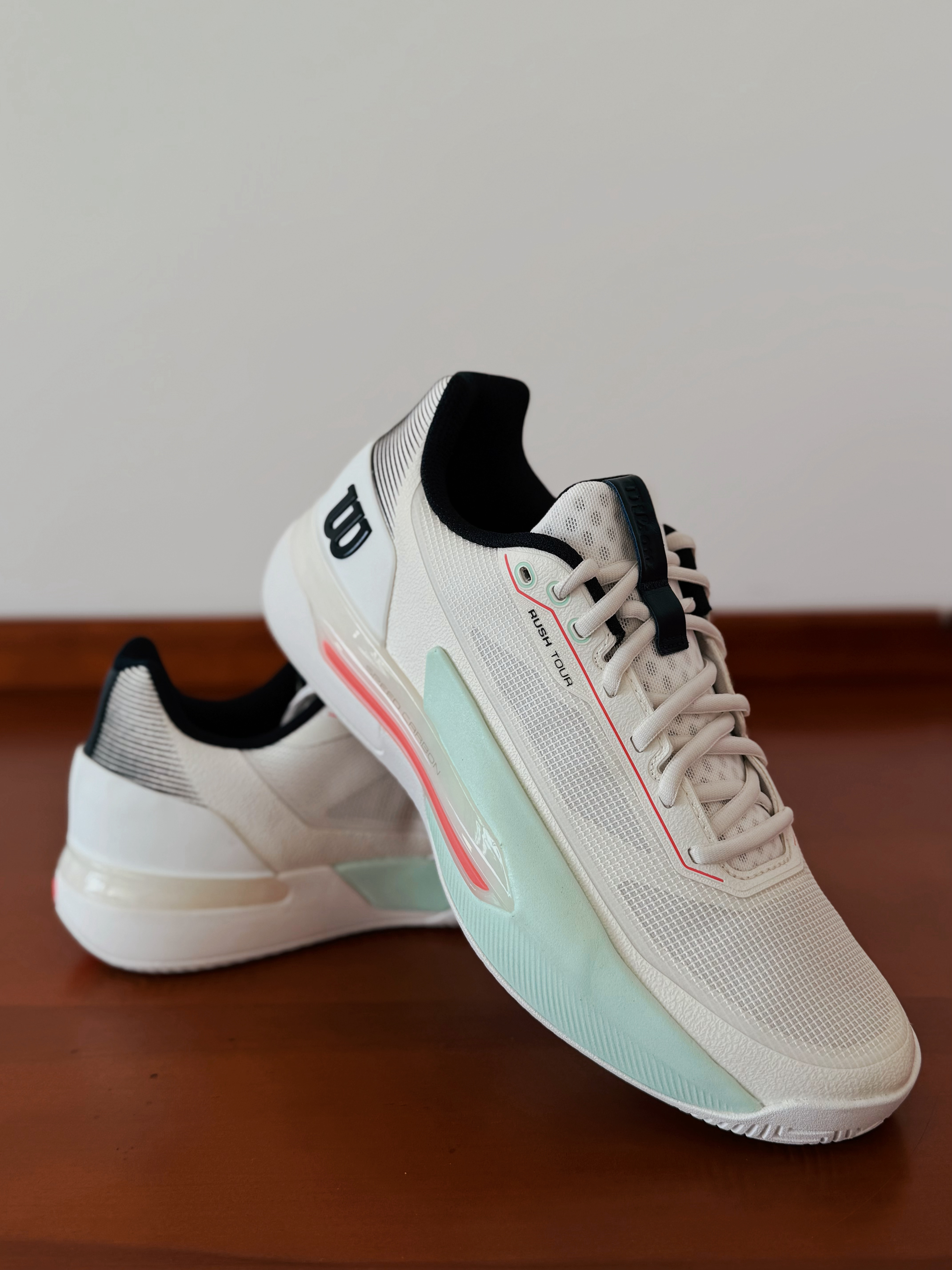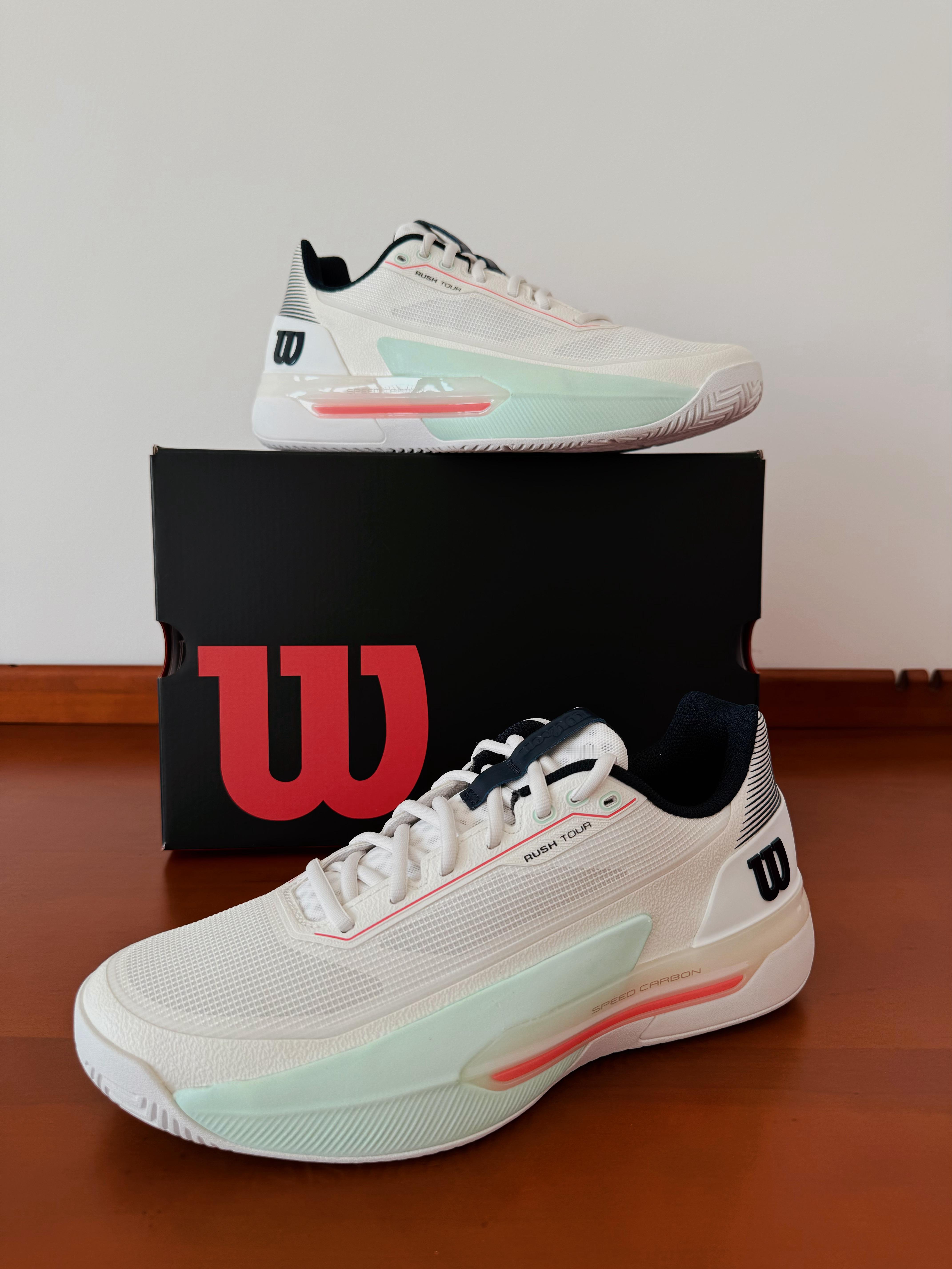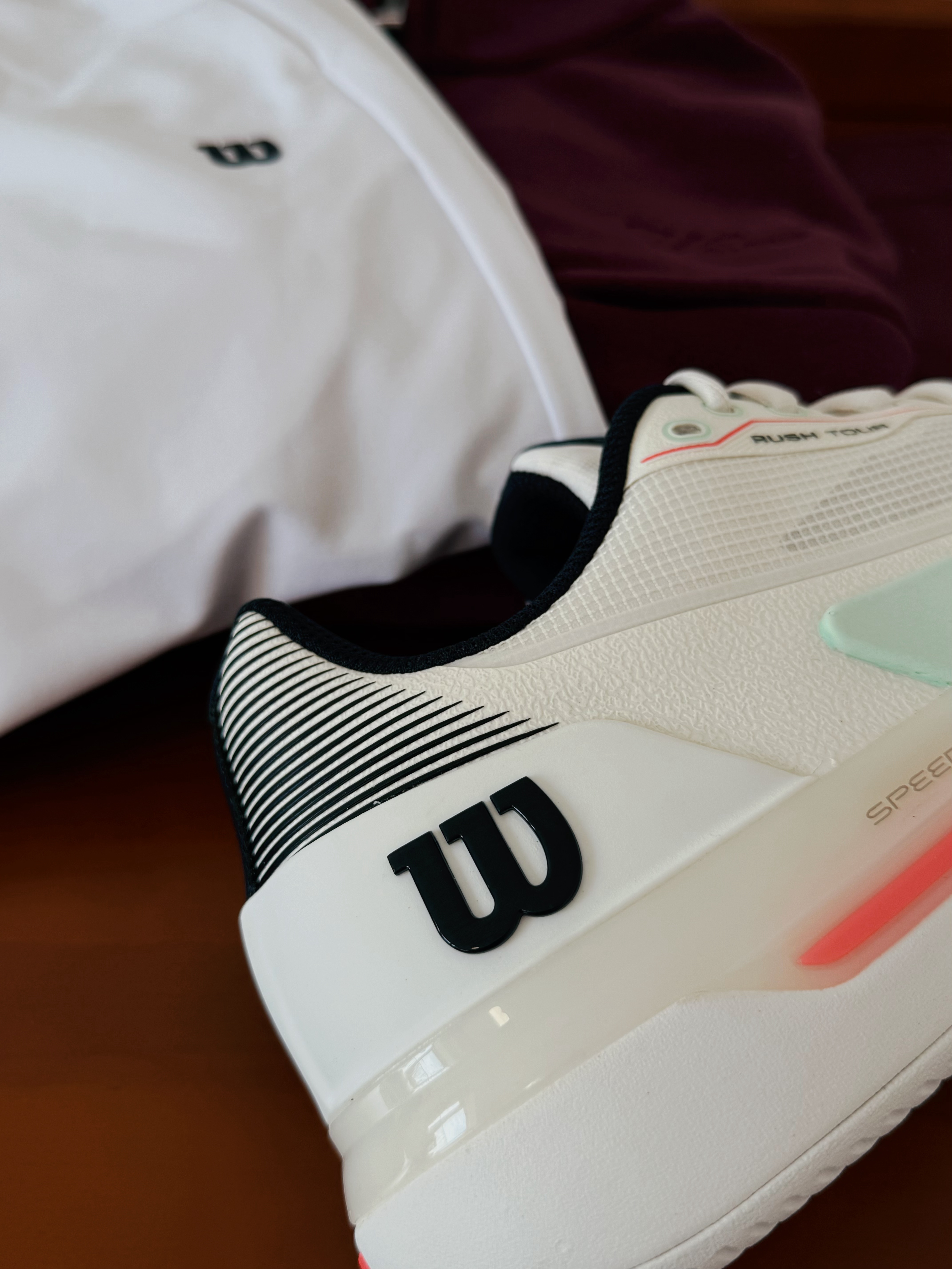 实不相瞒,看到德米纳尔实战上脚这款战靴时第一眼我就相中,首先是配色深得我心,白色+海湾蓝+炽珊瑚红,100%适配春天。W家的球鞋设计这些年来一直在精进。这双Rush 5 Tour专为竞技赛场设计,提高速度稳定移动,同时在击球瞬间提供爆发力支撑。