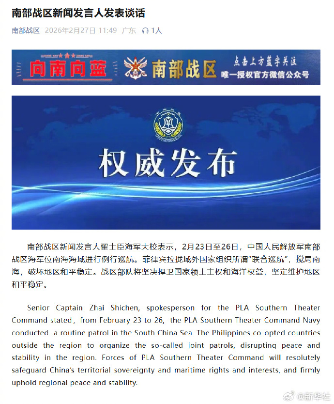 【#针对菲律宾所谓联合巡航南部战区发声#】#菲律宾所谓联合巡航破坏地区和平#南部战区新闻发言人翟士臣海军大校表示,2月23日至26日,中国人民解放军南部战区海军位南海海域进行例行巡航。菲律宾拉拢域外国家组织所谓“联合巡航”,搅局南海,破坏地区和平稳定。战区部队将坚决捍卫国家领土主权和海洋权益,坚定维护地区和平稳定。(南部战区)