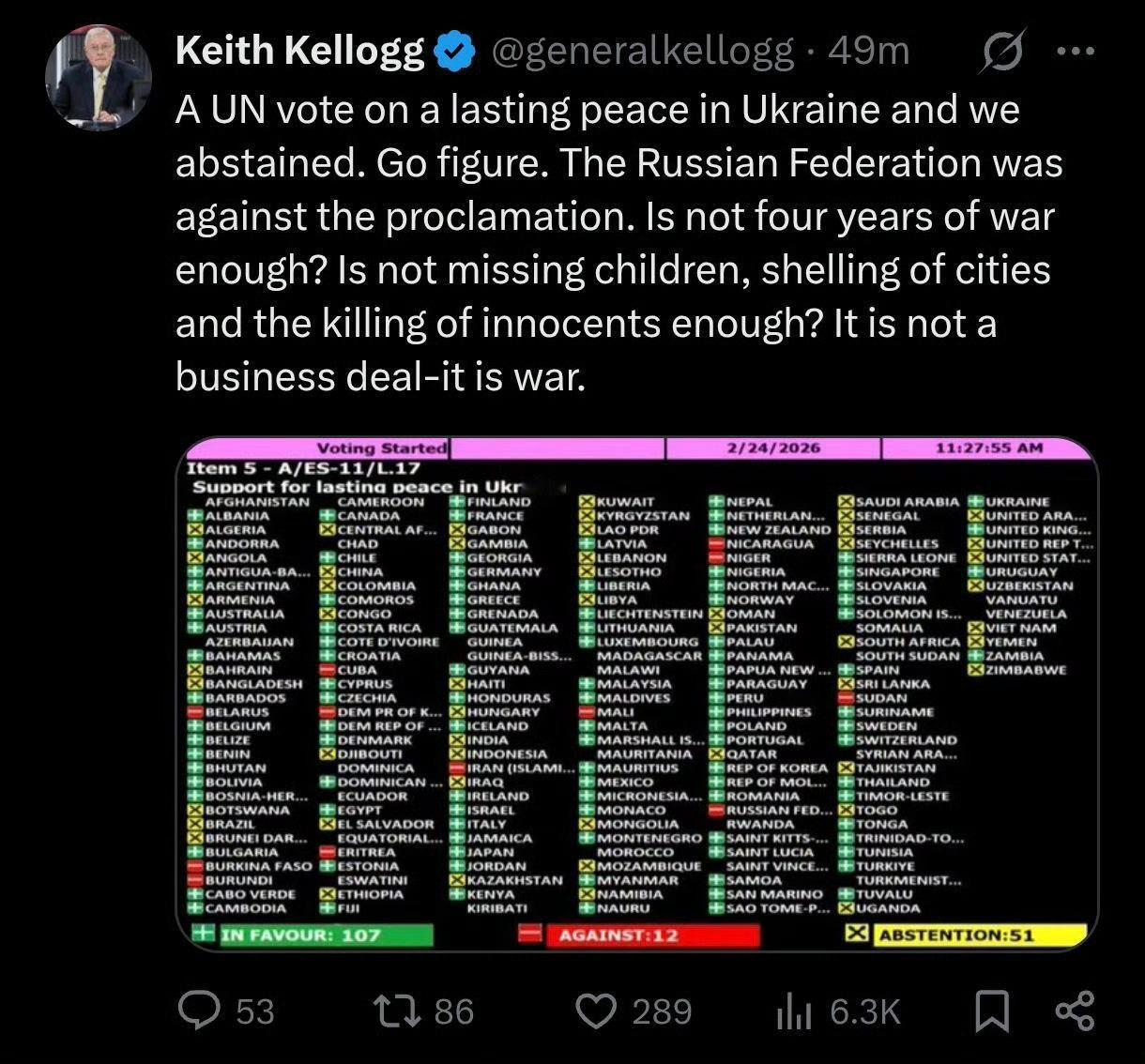 美国前总统特使凯洛格谴责美国拒绝支持联合国关于乌克兰和平的决议。“联合国投票支持乌克兰实现持久和平,而我们却投了弃权票。想想看,俄罗斯联邦也反对这项决议。四年的战争还不够吗?儿童失踪、城市遭到炮击、无辜民众被杀害还不够吗?这不是商业交易,这是战争。”