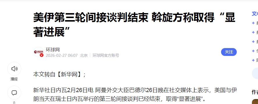 坏消息!美国和伊朗第三轮谈判结束了! 当地时间 2 月 26 日,备受全球关注的美伊第三轮间接谈判,在日内瓦正式落下帷幕,这场由阿曼从中斡旋、持续约三小时的闭门会谈,没有出现突破性进展,没有签署共同文件,甚至没有对外公布一致立场,双方代表团在阿曼大使官邸短暂交流后,先后离场,现场气氛凝重,没有握手,没有合影,只有沉默的僵持。 麻烦看官老爷们右上角点击一下“关注”,既方便您进行讨论和分享,又能给您带来不一样的参与感,感谢您的支持! 当地时间2月26日,美伊第三轮间接谈判在日内瓦结束,谈了三个小时,没有联合声明,没有突破性进展,双方连一张象征性的合影都没有留下,气氛冷到什么程度,从细节就能看出来。 这场谈判不是突然发生的,过去几个月,美伊围绕核问题和制裁问题反复试探,阿曼居中传话,地点选在瑞士,形式是各待一屋,通过中间人来回沟通,能坐到一栋楼里,却不愿面对面,这本身就说明信任已经薄到几乎透明。 表面上谈的是铀浓缩比例、核查机制这些技术问题,实际上较量的是地区秩序的主导权,是谁说了算,美国希望伊朗在核活动、导弹能力上全面受限,同时保留对制裁的主动权,伊朗要的是一次性、可验证的解除制裁,并且不把国家安全底线摆上谈判桌。 时间点很关键,美国国内正处在政治周期的敏感阶段,任何对伊朗的让步都会被放大解读,伊朗内部同样复杂,长期被制裁的社会氛围,对外部压力高度警惕,谁也不愿意背上“软弱”的标签。 更耐人寻味的是谈判之外的动作,就在会谈前后,美军在中东的部署明显加密,航母编队向东地中海靠拢,隐形战机进驻盟友基地,反导系统加强戒备,这种节奏,不是摆拍,是实打实的信号。 问题来了,一边谈,一边把最锋利的武器推到前线,这种姿态是在为和平铺路,还是在给谈判加码压力?如果谈判真有空间,为什么军事节奏还在提速。 美国当然有它的算计,通过高强度部署制造心理压力,让对手在谈判桌上感到时间不在自己一边,这种方式在过去几十年里多次使用过,很多时候也确实奏效。 但今天的中东,已经不是二十年前的中东,地区国家更自主,外部力量更分散,能源结构也在变化,单纯依靠军事威慑来塑造结果,成本越来越高,效果却未必成比例。 伊朗的态度看似强硬,其实更多是一种防御逻辑,多年制裁让它习惯了高压环境,也形成了对外谈判的谨慎心态,分步解除制裁听起来灵活,执行起来却可能留下太多不确定性。 再看地区层面,霍尔木兹海峡是全球重要的能源通道,一旦局势失控,油价波动几乎是必然反应,国际市场对风险的敏感度很高,哪怕只是紧张升级的信号,也会带来连锁效应。 对中国来说,这不是远方的新闻,我们是能源进口大国,航运安全、油价变化都会直接传导到企业成本和民生价格,中东多一分稳定,全球经济就少一分震荡。 还有一个现实问题,双方其实都不想真正开战,战争意味着不可控的后果,意味着地区全面卷入,意味着全球市场剧烈动荡,可谁都不能在气势上先退一步,这种僵局本身就危险。 军事力量靠得太近,误判的概率自然上升,一次擦枪走火,一次错误解读,都可能把本来可以在谈判桌上解决的问题推向不可逆的方向,历史上类似的例子并不少见。 从更长的时间线看,这场博弈折射的是国际格局的变化,单极主导的时代正在松动,多极力量在拉扯,规则如何重塑,各方都在试探边界。 中国的立场很清晰,尊重主权,反对单边制裁,倡导通过对话解决争端,说起来简单,做起来不容易,但方向必须明确。 这轮谈判没有成果,并不等于大门彻底关闭,外交从来不是一蹴而就,很多重大协议都是在反复拉锯中慢慢形成,关键在于各方是否愿意为长期稳定付出现实成本。 日内瓦的沉默,其实是一声提醒,提醒所有参与者,军事威慑可以制造压力,却很难制造信任,真正能让局势降温的,还是对彼此底线的尊重和对风险的清醒认知。 接下来会发生什么,没有人能给出确定答案,局势可能缓和,也可能继续紧绷,世界在看,中东在看,我们也在看,问题是,谁能在力量与克制之间找到那个不至于失控的平衡点。 对此大家有什么想说的呢?欢迎在评论区留言讨论,说出您的想法!