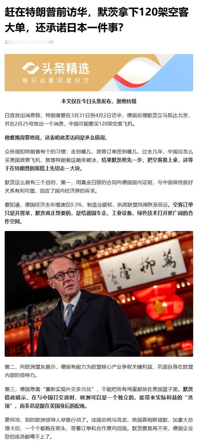 中方这个120架空客飞机订单,是足以压倒德国两党所有分歧的大订单。 对德国来说,领导人出访从来不是单纯握手合影,德国国内对华议题分裂严重,有人喊“降依赖”,有人喊“多合作”。默茨这次带团来中国,他既要谈政治框架也要给企业一个交代,还要给国内反对派一张能堵嘴的成绩单。 飞机是大宗商品,也是产业绑定,中国把空客推上桌,在中欧经贸关系里加了一根钢筋,不仅让默茨玩了一把漂亮的"截胡",而且还卡在特朗普之前砍了美国波音公司一块大蛋糕。默茨那两句“轻飘飘”的话,表面像是在总结访问感受,实际是对德国国内政治的回击。 但是现在最难受的,估计非波音莫属了,本身产品就总出安全信任事故,供应链与交付还总出问题,美国政治人物更动不动就把企业订单当筹码。 如今特朗普还做着"让美国再次伟大"的梦,醒来却发现盟友个个跑得都比他快,蛋糕都要被切没了。