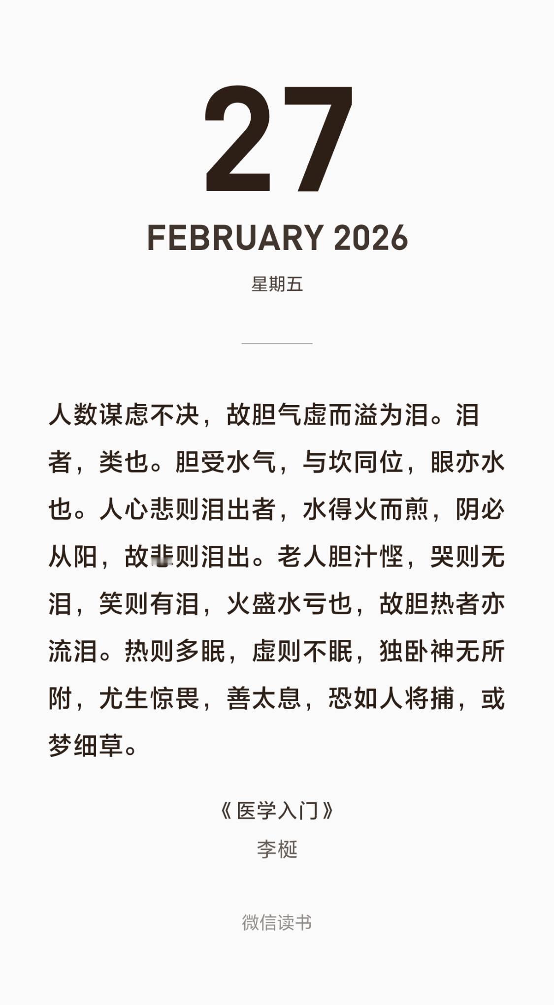 欲哭无泪是个描述虚证的词,意思是津液亏虚到产生不了泪液了(类似干燥综合征)。医学入门中专门解释了老人为何哭时无泪,笑时反而流泪。因为素体心气不降壅气—笑为心之志—笑时心气更亢—迫泪外出。 带定位晒今日生活 我的今日状态:😁轻松愉快 我这里的天气:☀️晴天