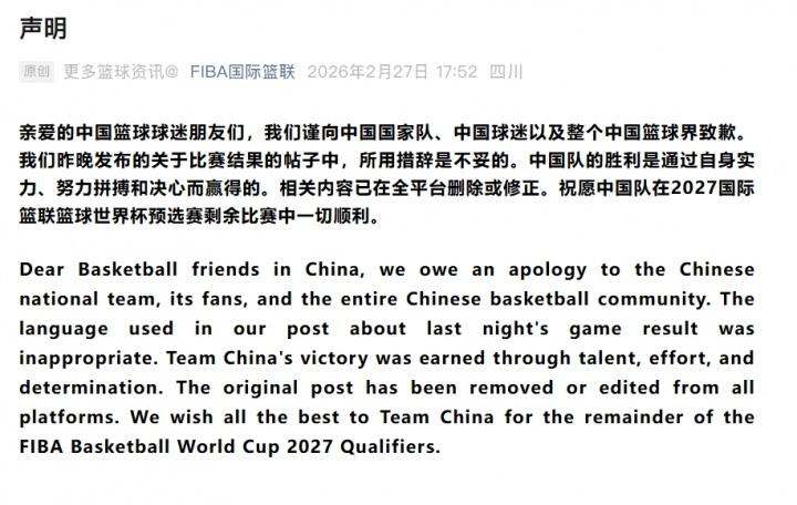 FIBA官方向中国男篮和球迷道歉: 此前FIBA官方的文案是中国男篮“偷走胜利”,修改后为中国男篮翻盘拿走胜利! 这次舆论倒逼,官方的道歉理由是“措辞不当”,但这种重大的国际比赛,很显然是从根子上烂掉了。 好在现在国家的强大带来了帮助,以前这种错误是理都不理,顶多删了就当没发生过。 只不过相比于这样的赛后声明,球迷更想看到的是公平公正的比赛,日本男篮第四节的吹罚待遇,简直是无法无天,但凡正常一点,中国男篮早就20分大胜收兵了,犯不上跟这帮人打到最后时刻,看裁判恶心人。