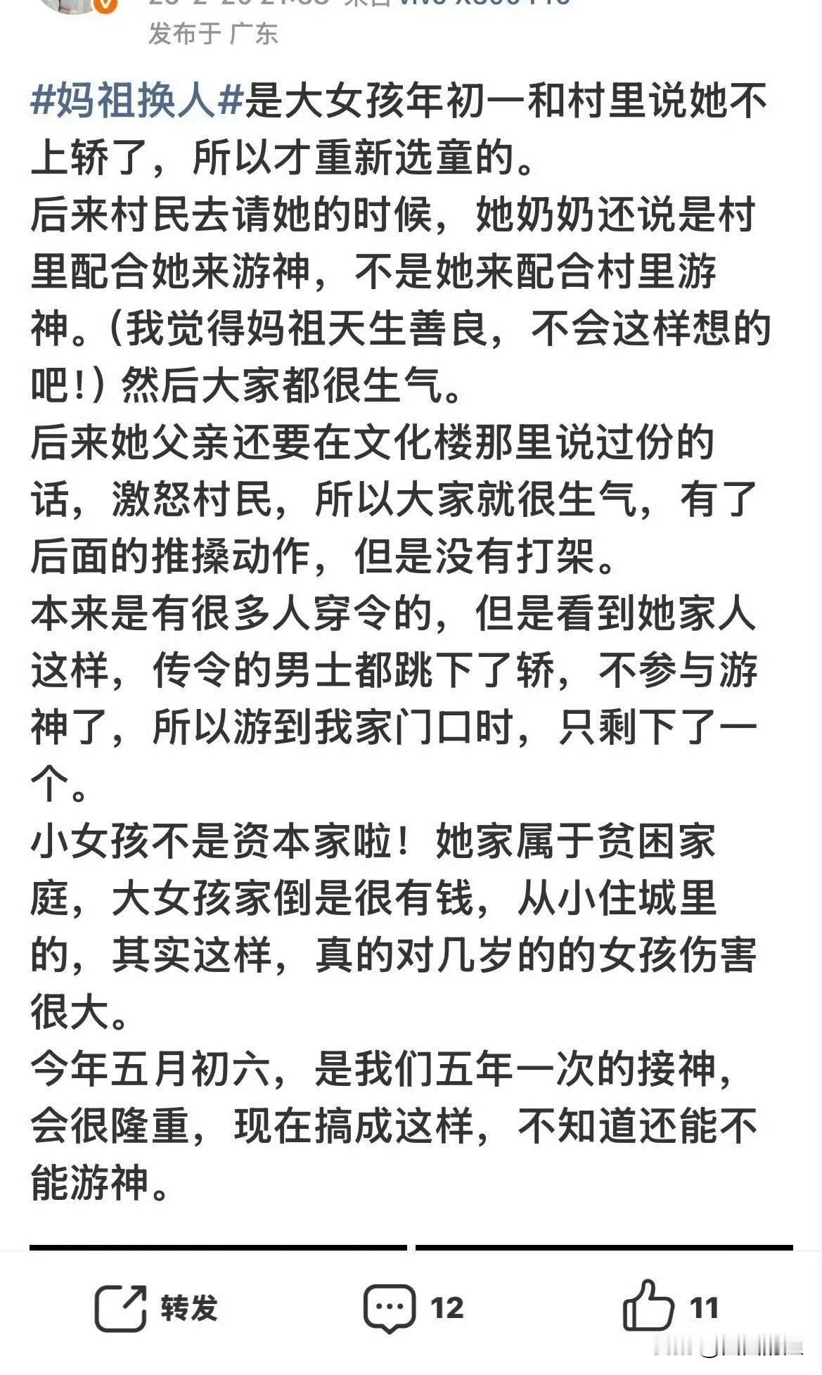 好好的民俗变味儿了!成了网红炒作的工具?看着那个穿红衣服女孩,账号粉丝一夜暴涨六十多万,转头就开始发跳舞的短视频,真的让人莫名其妙! 一开始,谁不觉得这事儿神圣?谁不觉得这习俗纯粹?咱们这些外人,哪怕不懂那些规矩,心里头也是带着几分敬畏的。可这事儿从头到尾发酵下来,哪还有什么敬畏可言?全成了算计! 你说那谣言传得,多离谱?什么“资本砸五十万换童”,什么“村长权势压人”,还有那“掷圣杯九次不允”的玄乎劲儿。我看着那些视频,心里犯嘀咕:这背后是不是有MCN机构在推波助澜?为了那点流量,为了那点热度,把人家一个未成年的小姑娘推到风口浪尖,脸都不打码,视频满天飞,恶意剪辑、造谣生事,这哪是捧红人?这分明是把人架在火上烤! 最让人失望的是什么?是那份原本该被尊重的信仰,最后硬生生被搞成了一场流量的狂欢。庄严的巡游,变成了博眼球的工具;纯粹的民俗,被掺进了铜臭味。你说你尊重传统,可你的行为就是在消费传统,在亵渎那份神圣。看着那些为了热度编故事、带节奏的人,我就想问一句:你们的良心,真的不会痛吗?