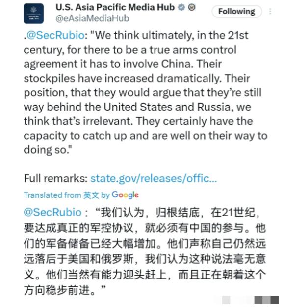 不认同中国的立场!美国国务卿鲁比奥再次点了中国的名!2月26日,美国国务卿鲁比奥表示, 我们认为,在21世纪,任何真正意义上的军控协议,都必须把中国纳入其中。中国的核武库规模已大幅扩张。中方所持的立场——即认为自身核力量仍远落后于美俄——我们认为这一点毫无意义。中国显然具备迎头赶上的能力,而且正朝着这个方向稳步前进。 美俄身为冷战“遗产大户”,其庞大核武库是历史累积的结果,而中国秉持“最低核威慑”原则,核力量仅用于自卫,如此,双方核力量差距的根源便清晰可辨。 美国国防部报告承认,中国洲际导弹数量超美,然而总弹头数仅为美国的11%、俄罗斯的10%,鲁比奥所谓“中国扩张”之说毫无实据,实则是为施压中国寻找托辞。 鲁比奥的急切,实则暗藏美国对核优势旁落的焦虑,其妄图借军控协议钳制中国核力量,维系“核霸权”,然而中方立场强硬:美俄削减至中国水平,或中国达美俄程度,谈判方显公平。 俄罗斯外交部长力挺中方,明确指出战略稳定的维系依赖多边合作,绝非单边施压所能达成,此观点彰显了对国际秩序健康发展的理性认知与担当。 真破局得靠核治理革新。中国用行动证明:核力量发展重“质”不重“量”,东风-41导弹全球覆盖,096核潜艇搭巨浪-3导弹射程12000公里,高超音速导弹拦截率不足20%。 这种“技术威慑”比堆数量管用,国际社会该搞新规则:重启军控对话,用科学评估核风险,强化“安全不可分割”理念,平衡各国安全需求。 积极推动核能的和平利用,以中国“人造太阳”项目为典范,促使核技术实现重大转变,从往昔的“毁人工具”华丽转身,成为如今推动发展的强劲“引擎”。 鲁比奥的“点名”暴露美国“以压促变”的旧脑筋,中国用“最低核威慑”加“技术革新”展现新时代智慧,核战争没赢家,真安全不在核弹头多,而在克制与对话的能力。 国际社会得跳出“威慑—反威慑”怪圈,建多边对话平台,定公平核裁军时间表,让核技术往民用领域使。 只有这样,才能从“核恐惧”跳到“核治理”,守住人类共同未来,这,才是鲁比奥“点名”背后,最该看懂的破局门道。