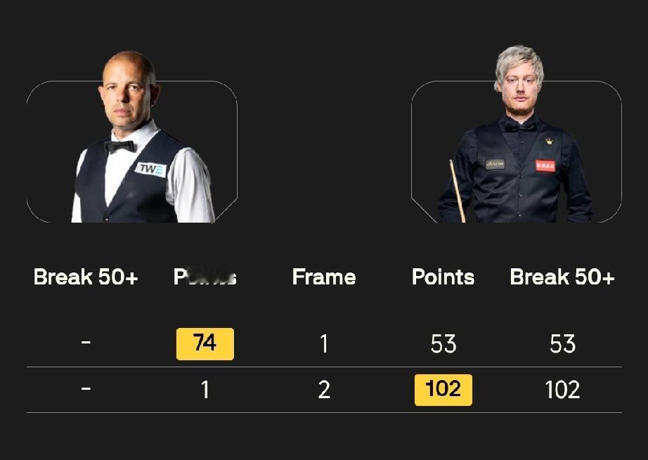 尼尔·罗伯逊 1-1 巴里·霍金斯 斯诺克威尔士公开赛1/4决赛,尼尔·罗伯逊对阵巴里·霍金斯,这是前16球员之间的对抗。上一轮,两人分别以4-3、4-2击败了杰克·琼斯、马克·威廉姆斯。 1/4决赛,9局5胜赛制。 前两局,尼尔·罗伯逊打出一杆破百一杆50+,与巴里·霍金斯战成1-1平局。