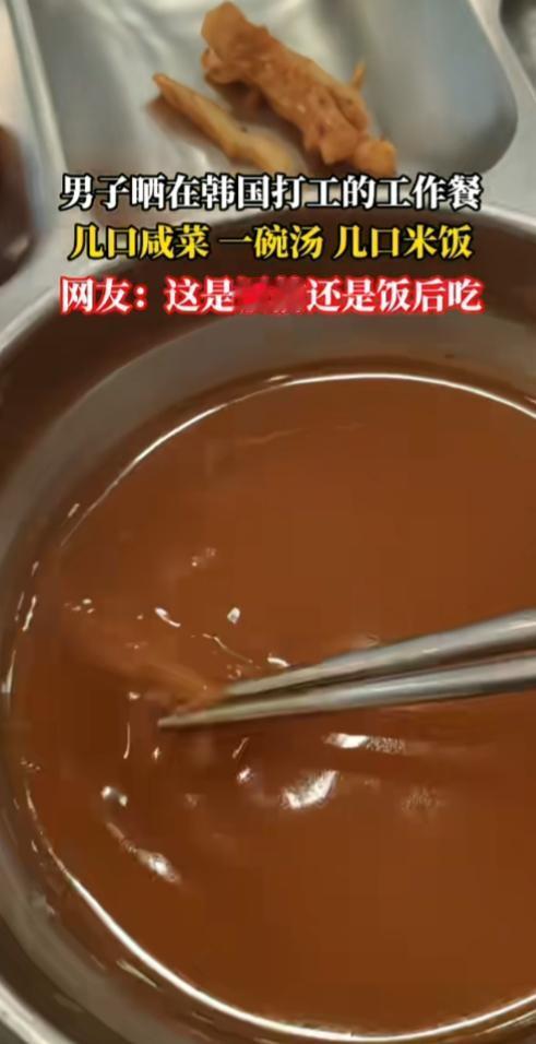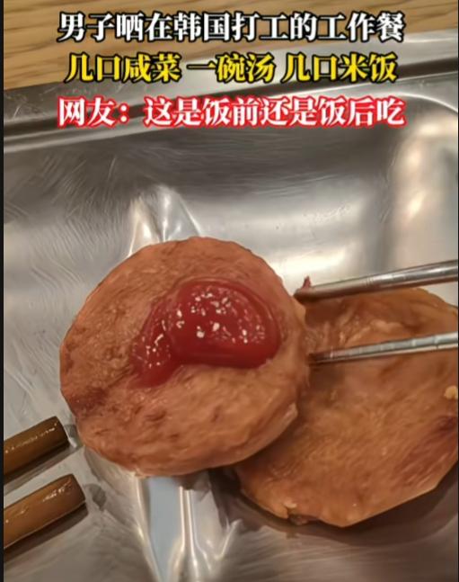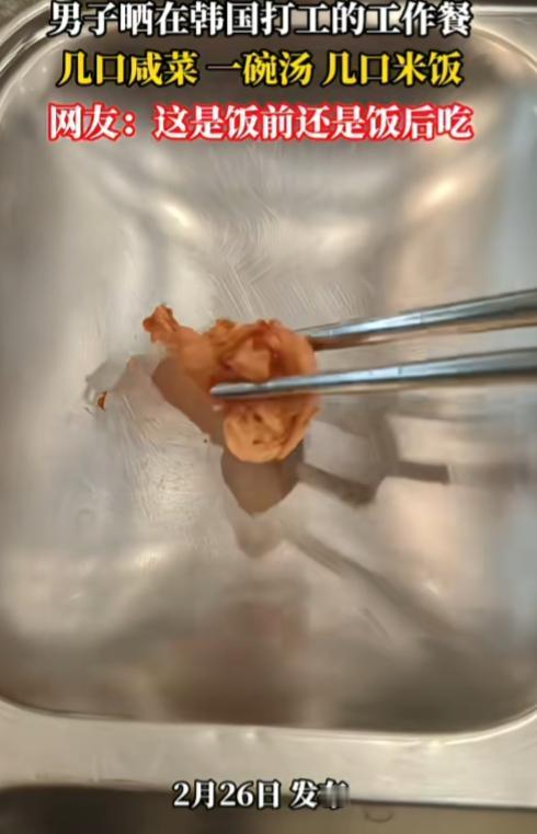 真的假的,这是韩国工作餐?就这伙食,狗看了都摇头吧。 一男子晒在韩国工作餐,几口咸菜,两个圆饼,一碗只看到水的汤,几口米饭。 看分量让人傻眼了,先不说好吃不好,这喂猫的量都比这个多吧。别说中年男子了,能吃得饱吗? 菜这么一点,餐盘还这么大,显得更加可怜。 这是减肥餐啊,吃这么点,饿瘦了是小事,长期应该会贫血吧。韩国打工人的苦啊,都在饭里了。