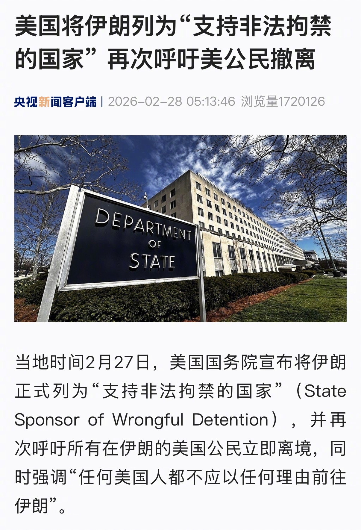 【美国将伊朗列为“支持非法拘禁的国家” 再次呼吁美公民撤离】当地时间2月27日,美国国务院宣布将伊朗正式列为“支持非法拘禁的国家”(State Sponsor of Wrongful Detention),并再次呼吁所有在伊朗的美国公民立即离境,同时强调“任何美国人都不应以任何理由前往伊朗”。