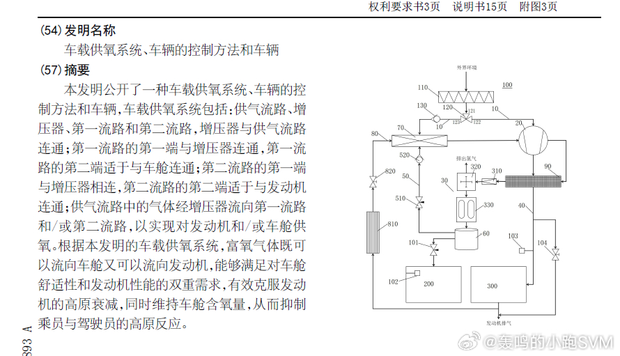 技术巡猎 比亚迪 车载供氧系统、车辆的控制方法和车辆---供氧的需求,被提出来已经有好几年了,很快我们就会在一些车上看到,比亚迪这只是个例子。聊一聊,这份专利主要是突破了“高原”的边界,把高原当成了一种可以被“管理”的整车工况,它想同时照顾两件非常现实的事---人尽量不要出现高反,以及发动机也不要出现高原性能衰减。
