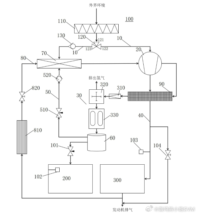 发动机侧更有意思:富氧并不是直接怼进进气歧管,而是先进气体混合器混一下。混合器的三个进口分别接:外界空气、来自储氧罐的富氧、以及EGR回来的废气再循环流路。EGR线上还配置了第一冷却器和第一控制阀。读到这里大概能感受到,它在给排放和燃烧温度留后手。甚至还考虑了到进气压力过高的风险,在发动机进气管路上提供旁通阀,把部分高温气体直接排到外界。