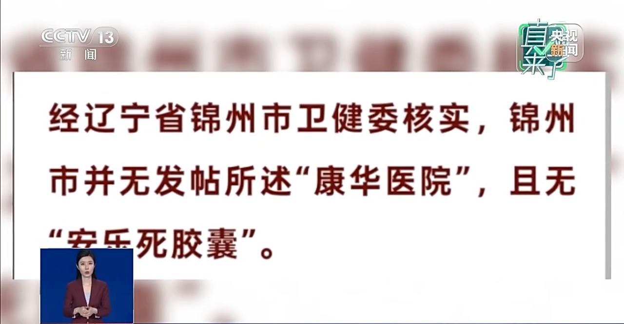 #医院有安乐死胶囊系谣言#【#官方回应一医院有安乐死胶囊查无此药无此院# 】近日,一则“安乐死胶囊30秒一觉离去,锦州康华医院让身患绝症的病人拥有死亡权利”的短视频在网络上迅速传播,引发关注。视频所言究竟是真是假?所谓的“安乐死胶囊”又是否存在?总台记者进行了调查。